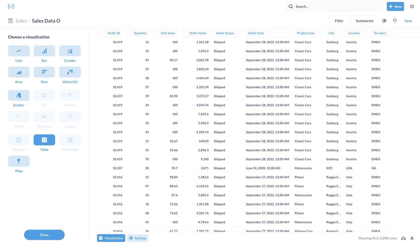 To visualize data, you can select a table from a data source and choose from the various visualization options: