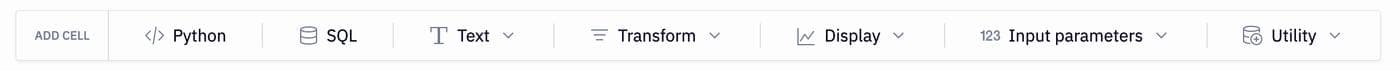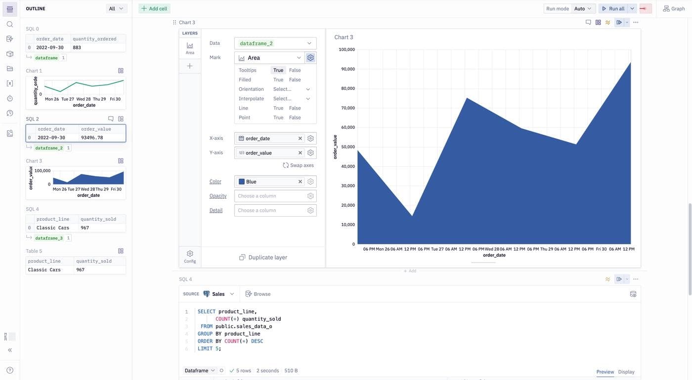 While Metabase and Preset both use an interface that resembles a traditional SQL editor, Hex is the most different and uses the notebook form factor. It supports a wide range of data sources and lets you interact with the data in several different ways: