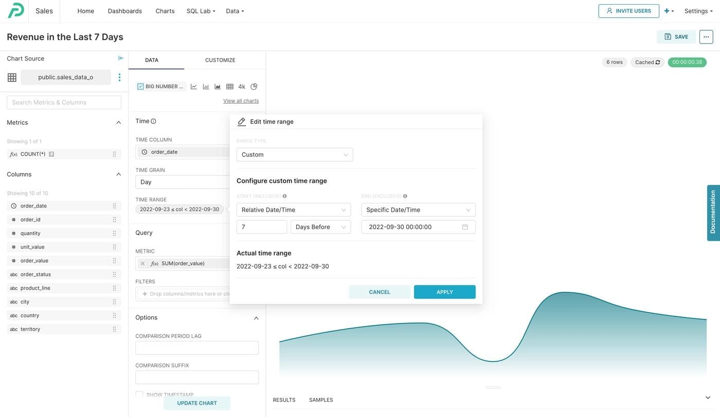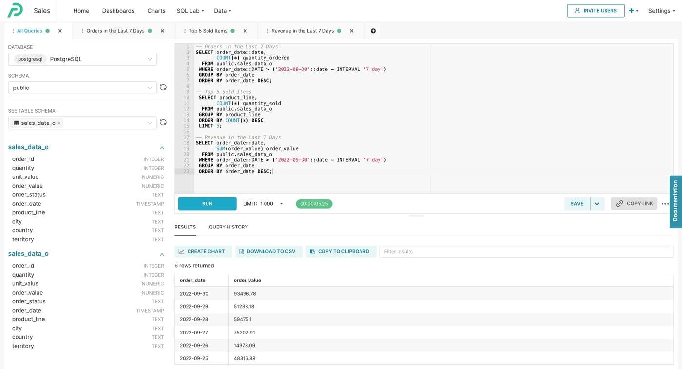 1 2 3 4 5 6 7-- Orders in the Last 7 Days SELECT order_date::DATE, SUM(quantity) quantity_ordered FROM public.sales_data_o WHERE order_date::DATE > ('2022-09-30'::date - INTERVAL '7 day') GROUP BY order_date ORDER BY order_date DESC;