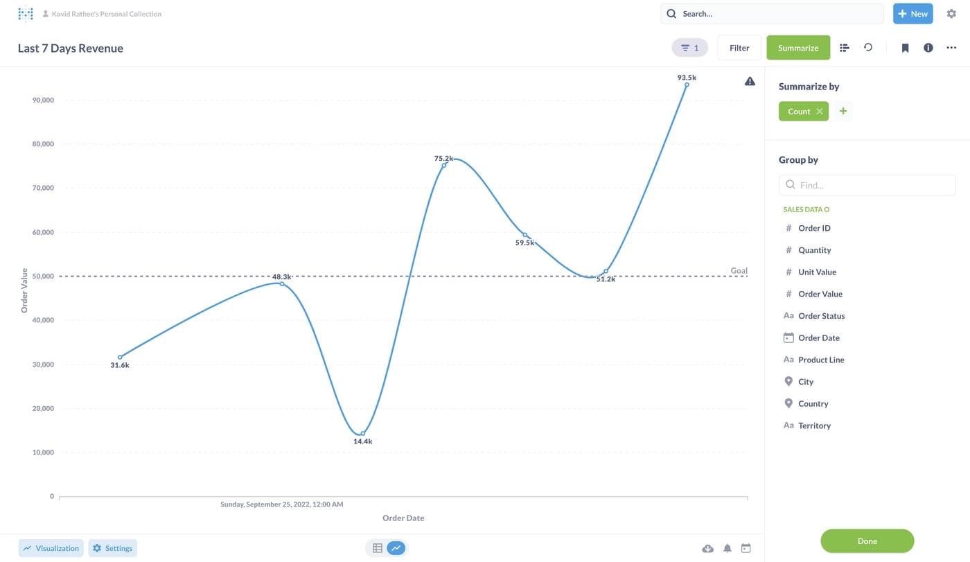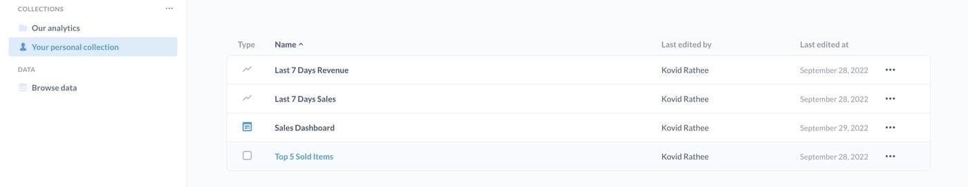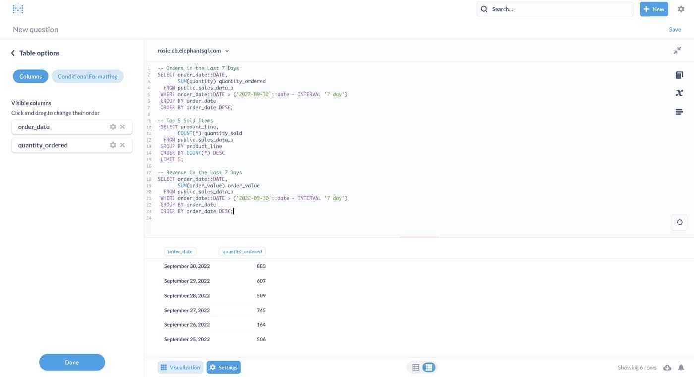 Metabase is an open-source GUI for databases and warehouses. It categorizes its GUI features into four categories: Questions, SQL Queries, Dashboards, and Collections. Questions and SQL Queries are the same, the former being the visual, form-based method of writing SQL queries and the latter being more visual. Dashboards, similar to Preset, are collections of questions and SQL queries seen in a tabular or a chart format. Here's an example of a Question: