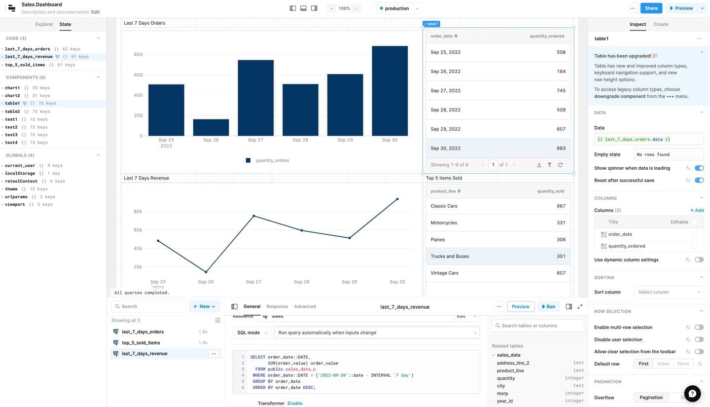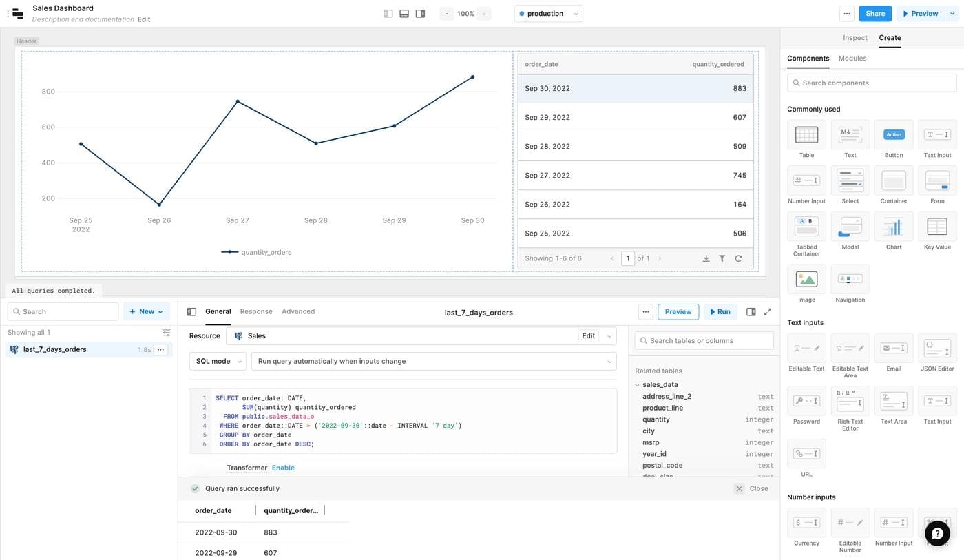 With modules ranging from embeddable tables, charts, text boxes, input boxes, etc., Retool empowers you to build end-to-end data-based applications. Notice the modules on the right-hand panel:
