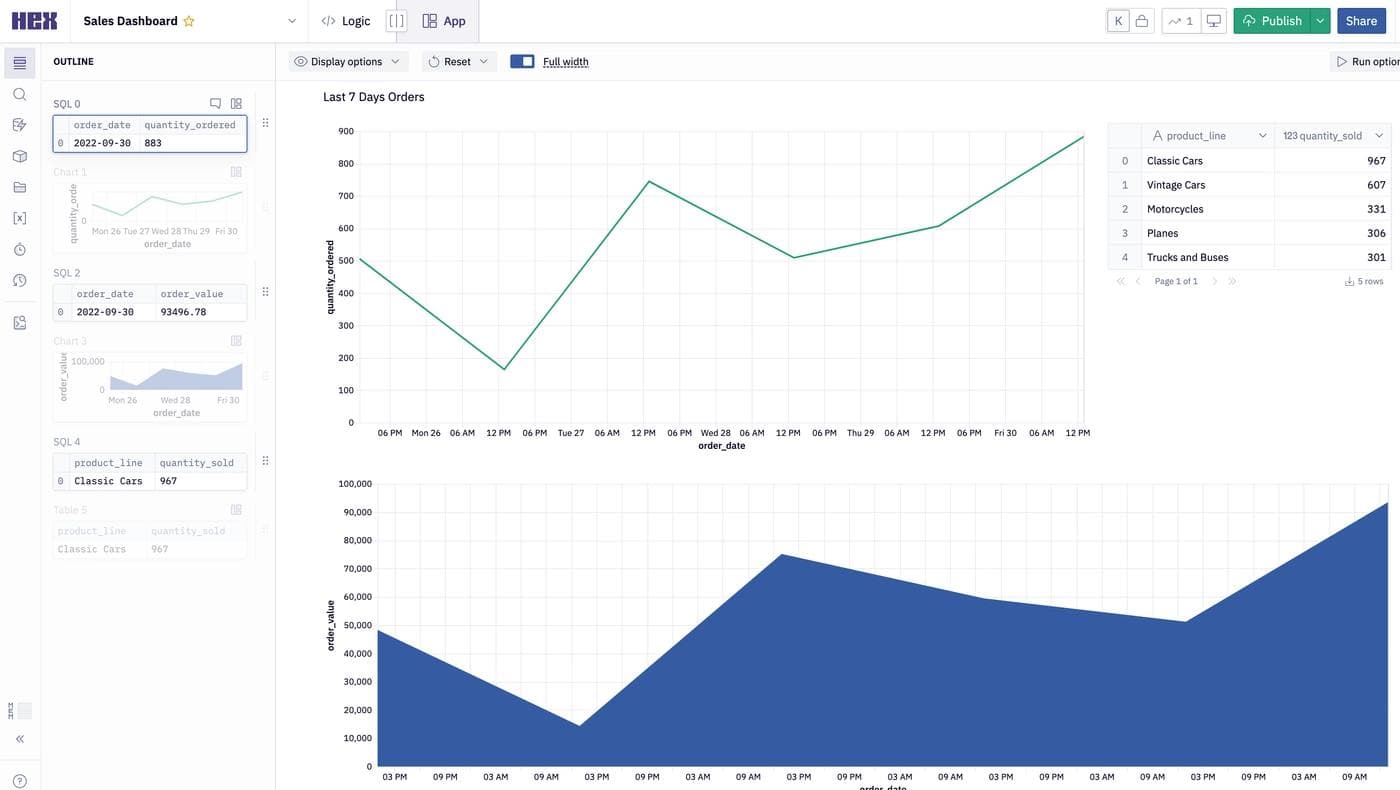 Hex operates on the primitives of Logic and App. The Logic layer is where you build all the different components, such as filtered tables, charts, analysis, etc. In the App layer, those different components come together to enable insights, as shown below.