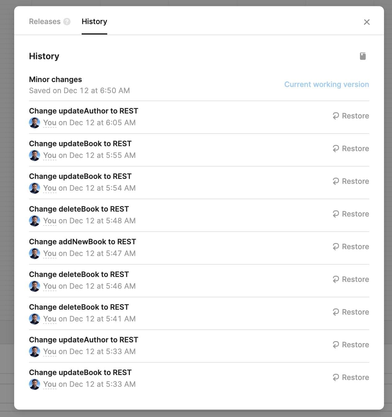 Retool maintains a complete history of changes you make to your app. You can browse through the list of changes, and revert an app to a previous state.