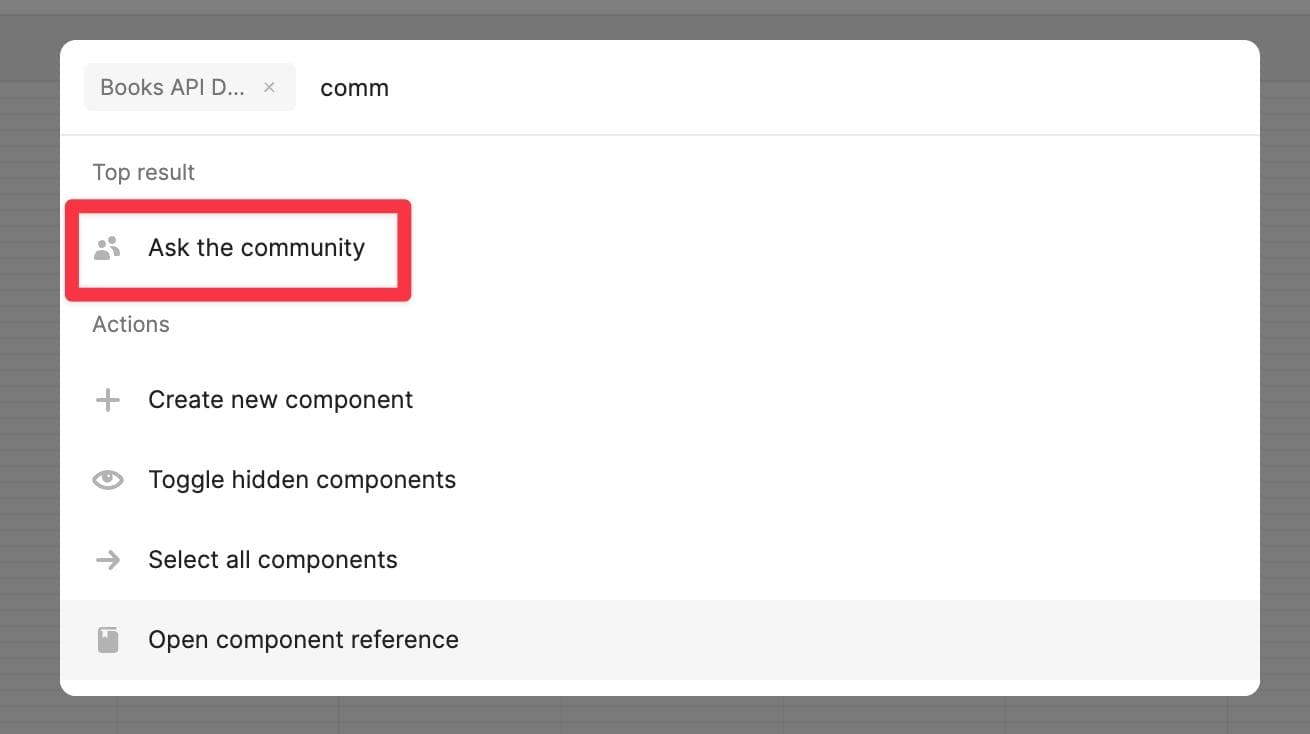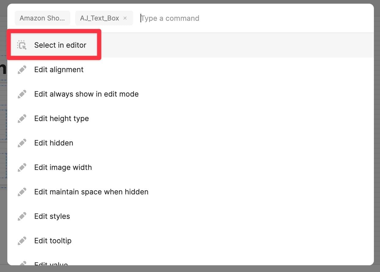 You can use the Command Palette to quickly find and select the components on the canvas. This is super helpful when you have components nested within containers, or are too close to each other making manual selection hard. Instead, you can simply type the name of the component in the Command Palette, and click “Select in editor”.