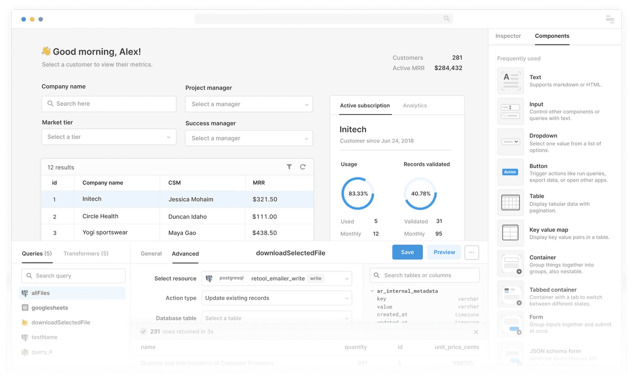 Retool is great for housekeeping — Retool frontend components make basic CRUD operations easy to do. For more complicated workflows, you can combine components into custom interfaces. You can hook them up to database queries or API endpoints that do whatever housekeeping tasks you have.