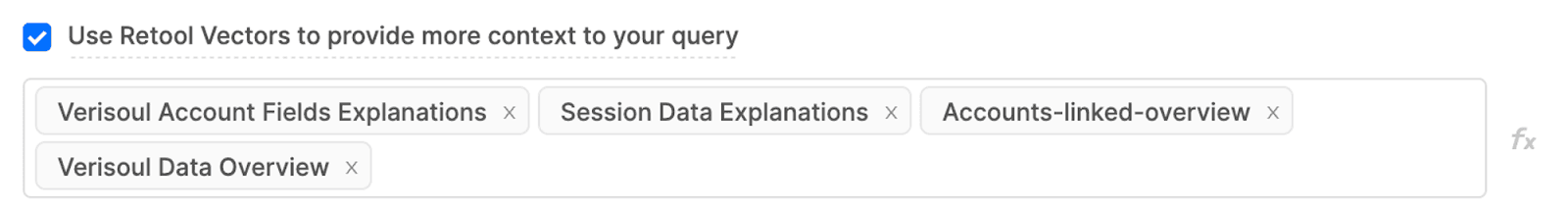 - Retool Vectors which is a managed vector database that allowed us to provide the AI chat tons of context about Verisoul’s fake user detection methodologies, field definitions, and documentation.