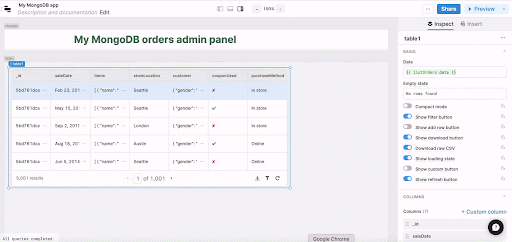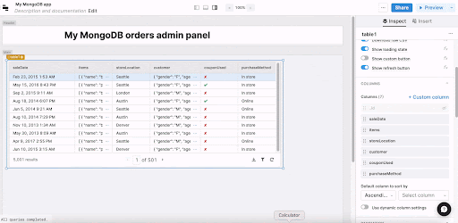 Let’s pull this data into our Retool UI. We’ll change the query to reference our MongoDB resource, rename the query to “listOrders'', use the “find” action on the “sales” collection, then run the query to return our sales order data. Dragging a table onto the UI panel will then automatically populate the table with data from our last saved query results, which will be our sales orders data.