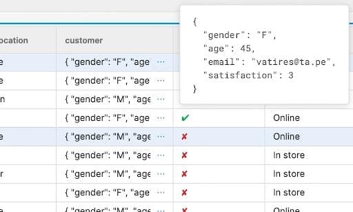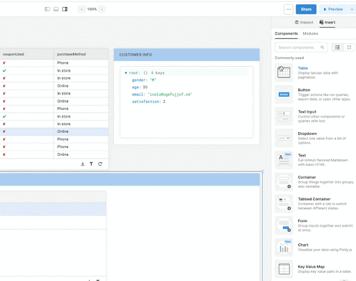 Retool lets you inspect data in each cell: in this case, customer data is a JSON object with properties like gender, age and email.