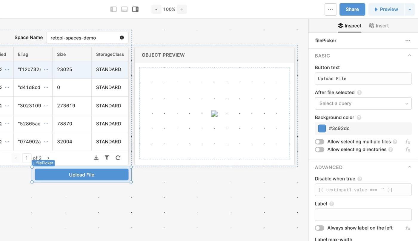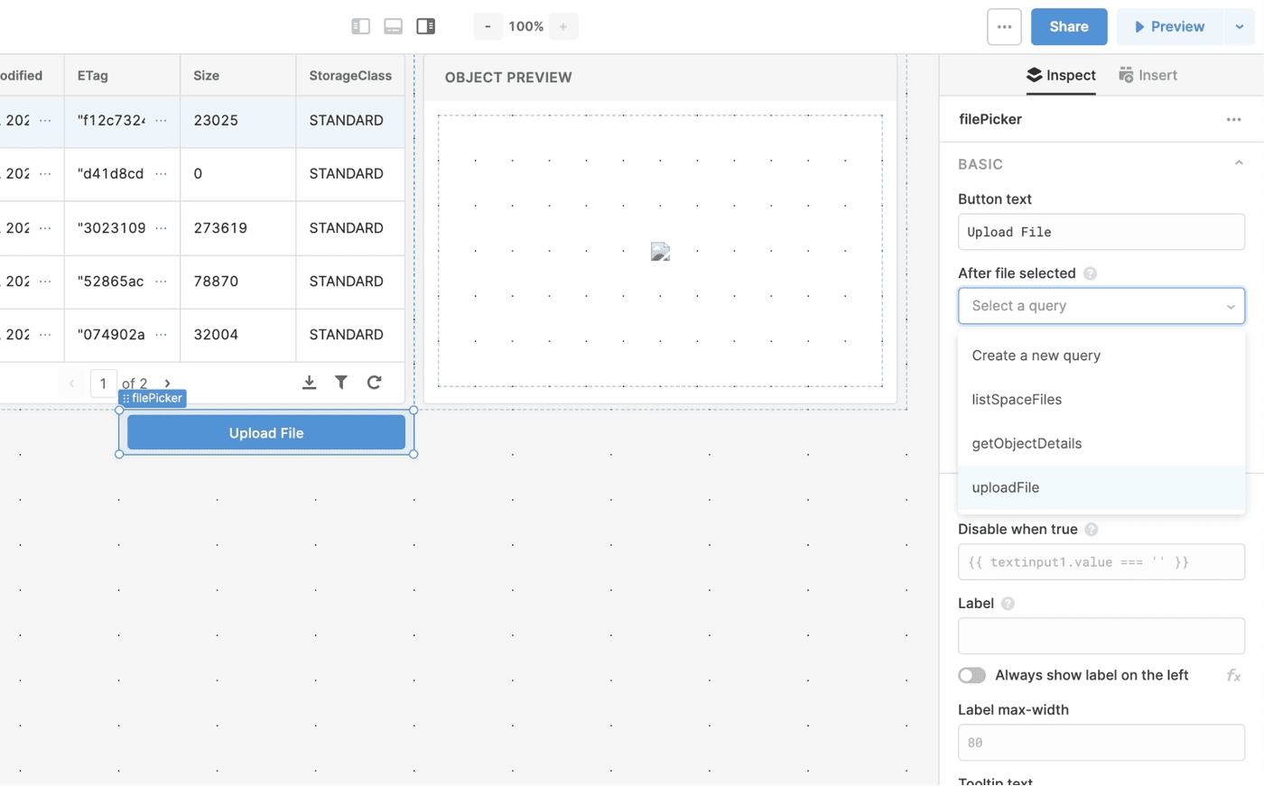 Retool has an out-of-the-box component for uploading files to S3 compatible storage, but we’ll work with Retool’s generic file picker component and then trigger a query (for more customizability). Start by dragging a file picker component onto the canvas. Let’s rename it filePicker.