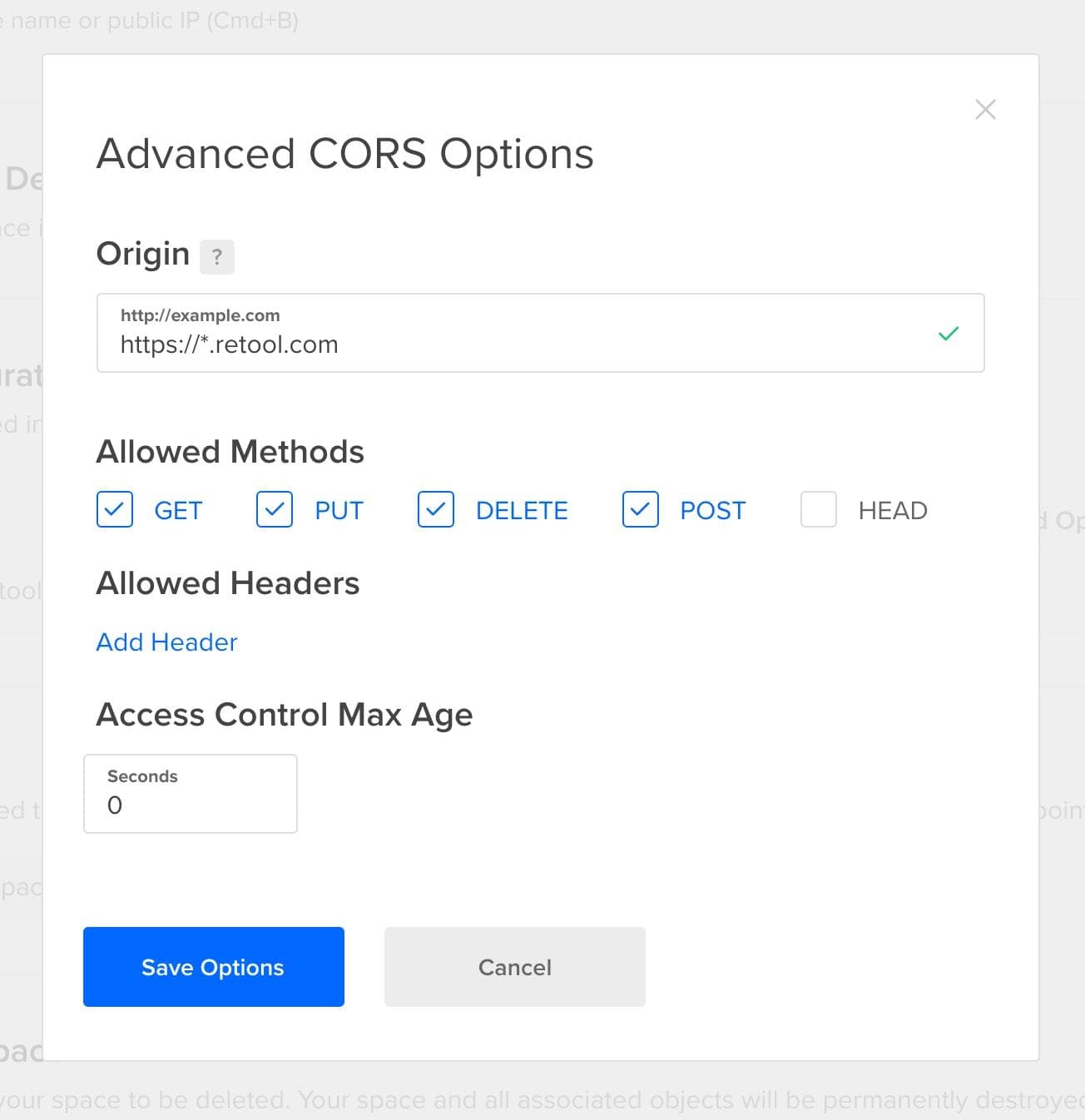 If you get errors on upload, it’s likely related to a CORS (Cross Origin Resource Sharing) issue. Your Space is going to reject write requests (i.e. PUT and POST) by default, which is what we’re trying to do here with our file uploader. To get around that, you’ll need to create a new CORS configuration in your Space settings: