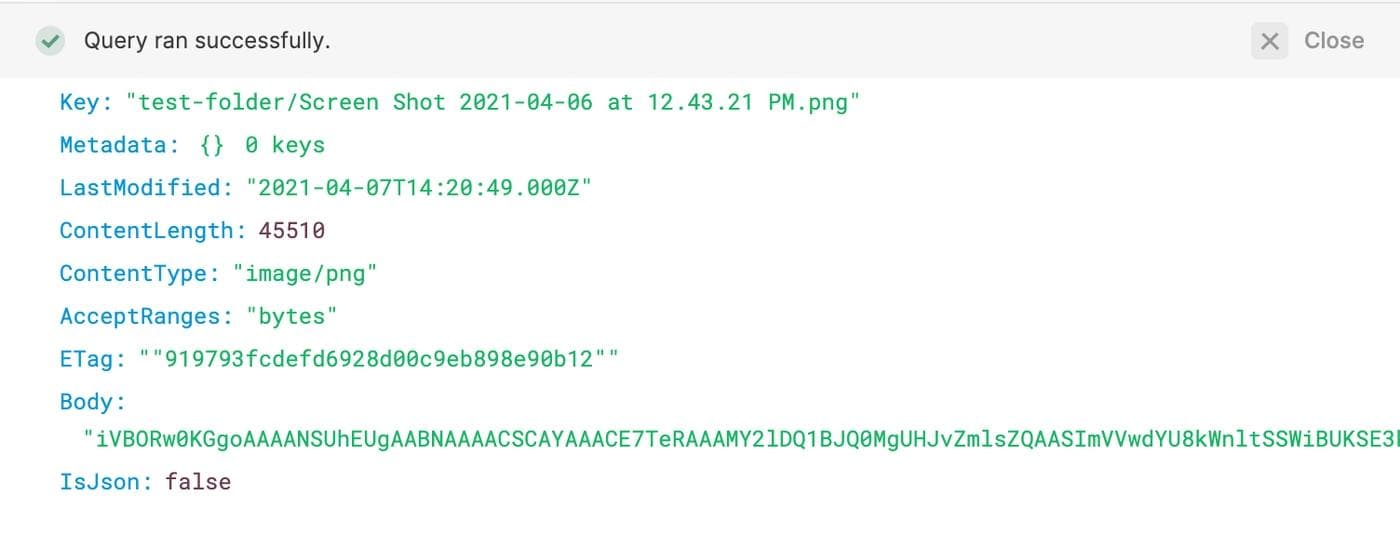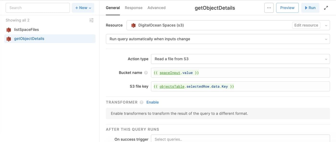 For the “S3 file key” input, we’re going to reference the currently selected table row with {{ objectsTable.selectedRow.data.Key }}. This is going to update dynamically as you select different rows in the table. For the query’s run settings, we’re keeping it as “Run query automatically when inputs change” so that our query will automatically fetch the object that’s currently chosen in our table.