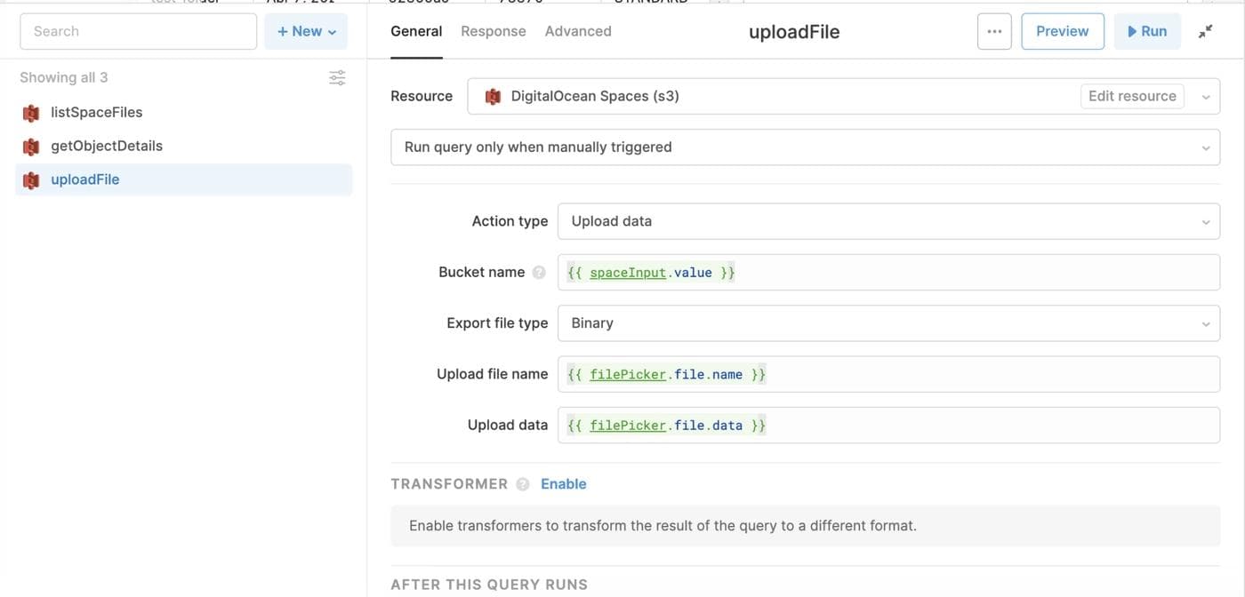 Now we’ll build a query that uploads whatever file you’ve selected with the picker into our Space. Create a new query, choose our DigitalOcean Spaces resource, and then the “Upload data” option from the “Action type” dropdown. As usual, we’ll populate the “bucket name” field with a reference to our text input’s value.