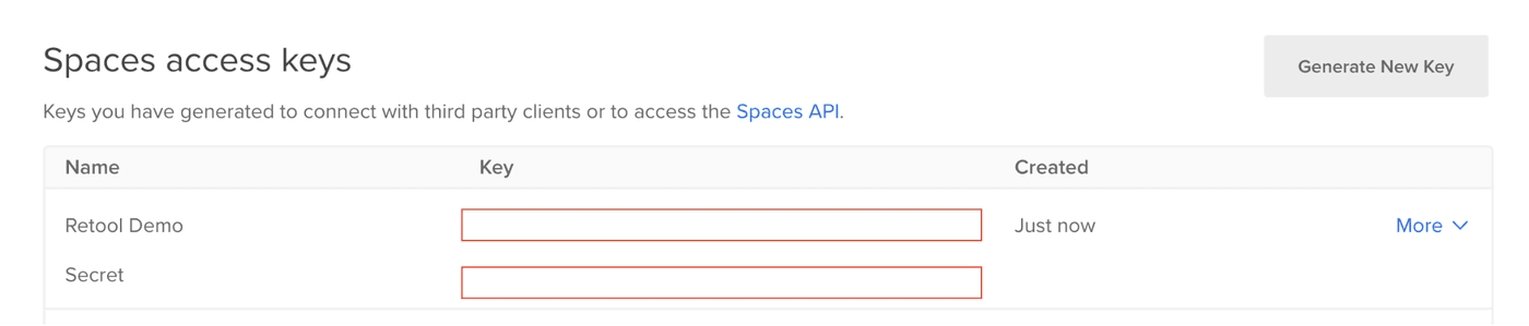 → Access keys: follow the tutorial here to generate an API key for Spaces. For the Access key ID, put in the first value. For the Secret access Key ID, put in the secret key.