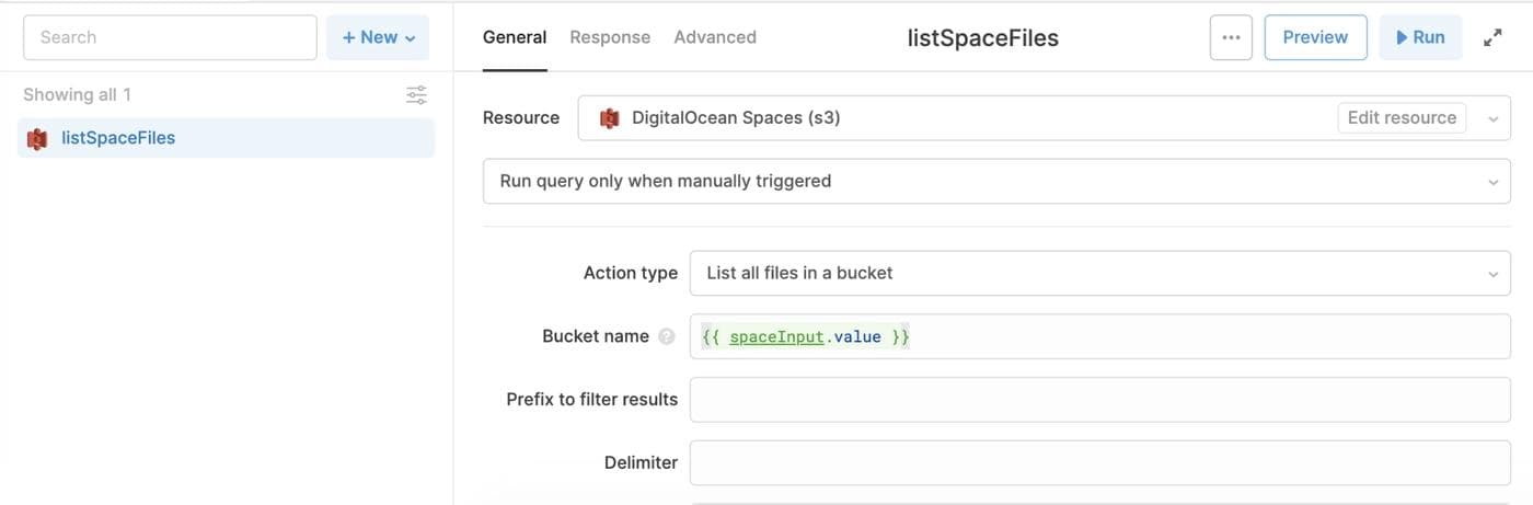 To get details of a particular object, we’ll need to create a second query. Create a new query in your editor, select the DigitalOcean Spaces resource, and then choose the “Read a file from S3” option from the “Action type” dropdown. In the “Bucket name” field, we’ll fill in the same value from our last query - a reference to the text input in our app.