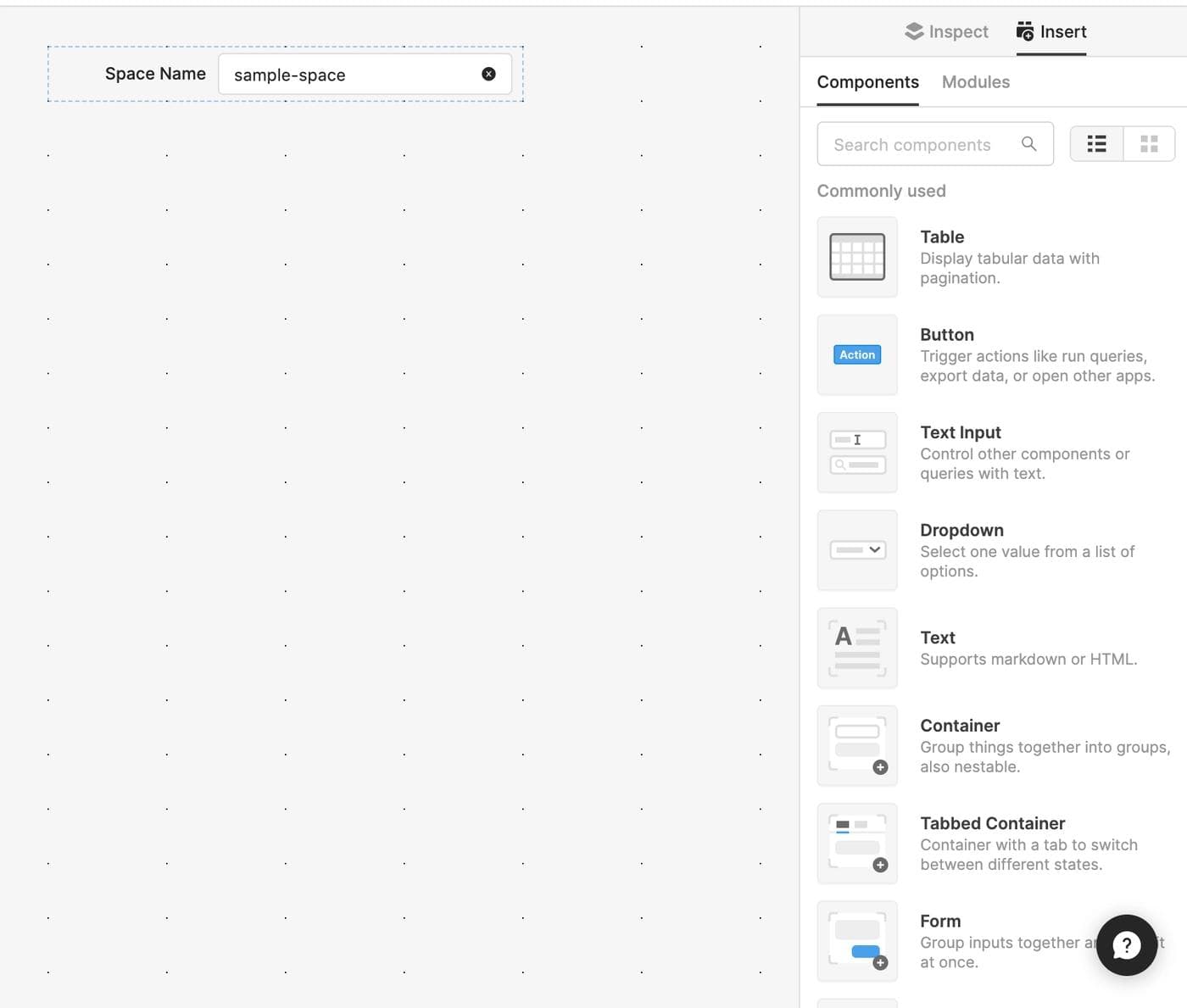 Drag a text input component onto the canvas, and for the label, put in “Space Name” for posterity. We can also rename the text input to spaceInput to make it easier to work with its properties. We’re going to reference that value of this input with spaceInput.value in just a minute.