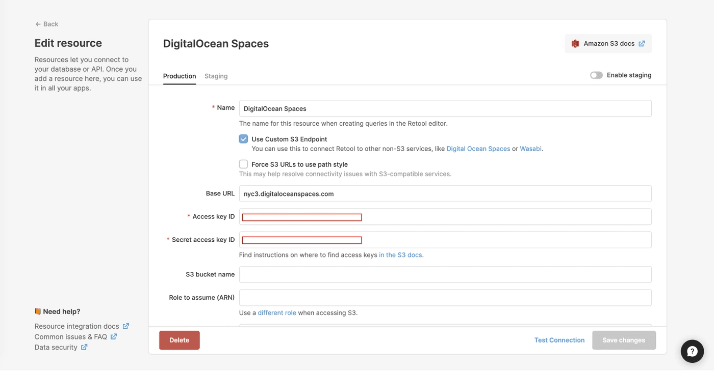To get started, we’ll want to create a new resource in Retool that connects to our Spaces setup. The way we do that is through Retool’s S3 connector, but we’ll check the “Use Custom S3 Endpoint” box to let Retool know that we want to use a non-S3 service.