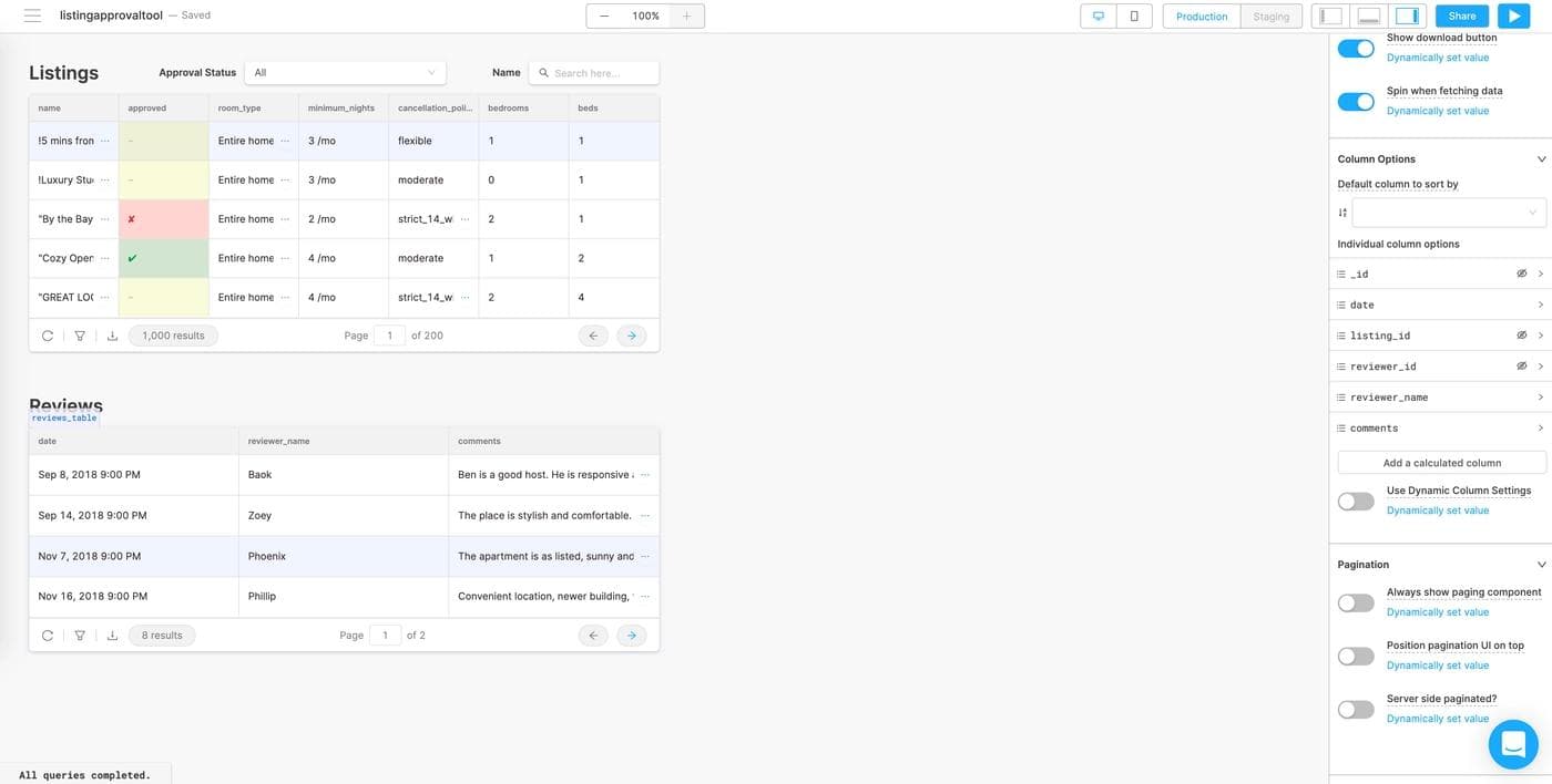 Callout: we need that index in there ([‘0’]) because MongoDB stores data as objects.If all went well, the reviews_table should now be showing the reviews from the selected from in the table above. Note: we could have done all of this with one query, but this is a bit simpler to grok the first time. We only really want a few columns related to the reviews, so click on the reviews_table component, head over to the right sidebar, and hide (with the “eye” icon on the columns) the _id, listing_id, and reviewer_id columns so that you only see the reviewer’s name, the review date, and the review content (“comments”).
