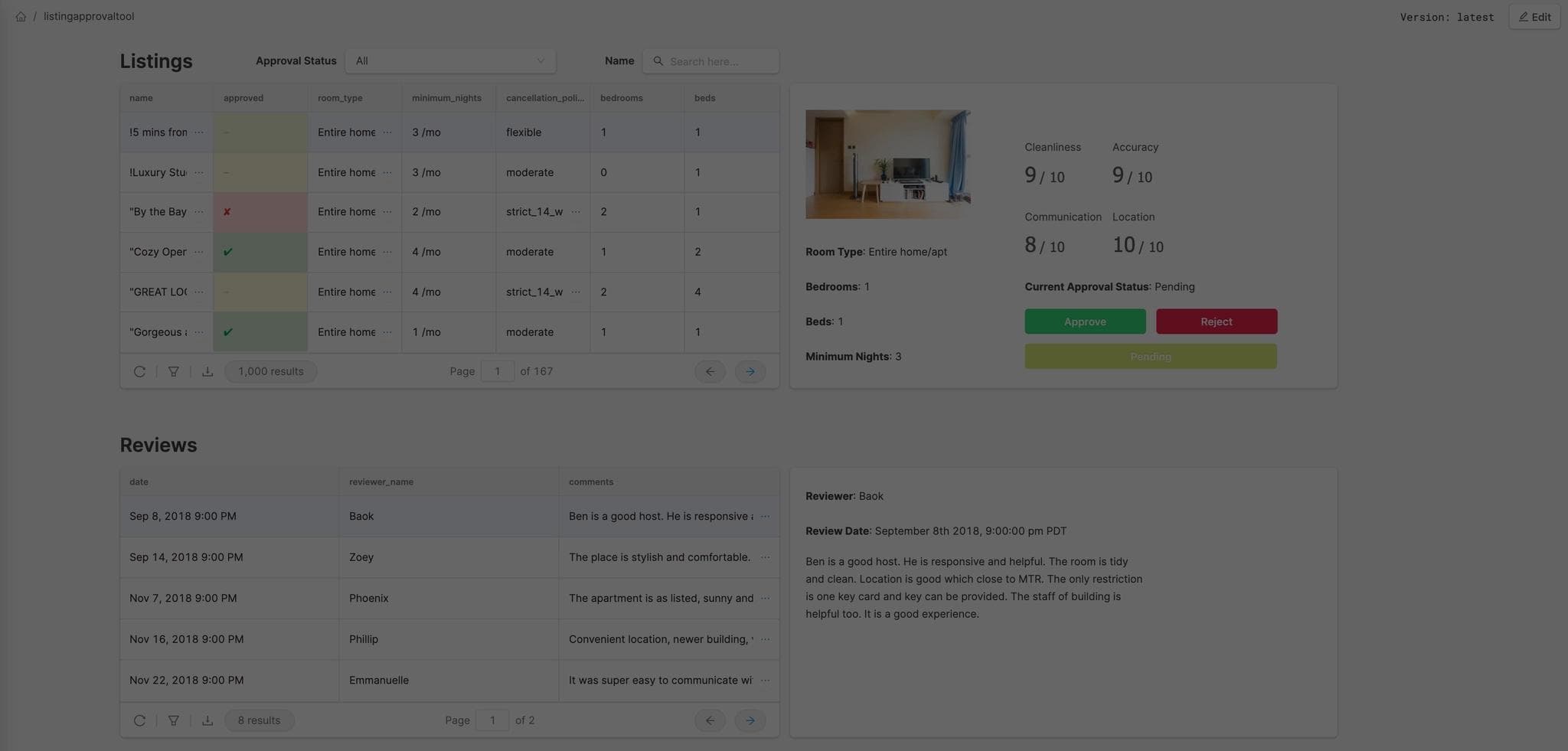 If you’ve ever worked at a marketplace company, you know that not every listing should be approved. If you’re managing any kind of listing data – apartments, ecommerce SKUs, or even vendor approvals – you might use or need a tool that lets you easily approve and reject them. In this post, we’re going to build a full featured Airbnb listing review app that reads and writes to MongoDB, with minimal code, in fewer than 60 minutes. Here’s what the finished product is going to look like (you can use it!):