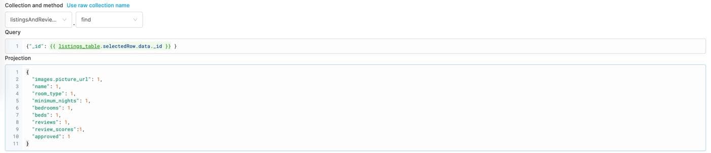 This line should filter the database for the _id of the row that’s currently selected in the listings_table. In the Projection box, we’ll choose a few fields that we’ll want to use later: