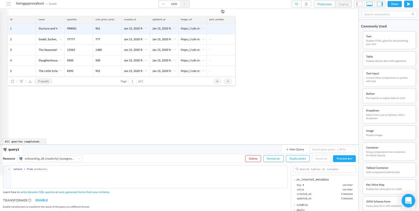 Let’s start by dragging a container component onto the canvas, to the right of our listings_table. We’ll add in a few pieces of data before the approval buttons: