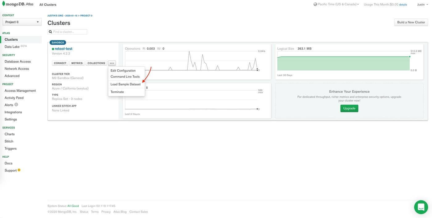 All you’ll need to get started is a MongoDB cluster loaded with their sample_airbnb dataset. MongoDB Cloud has a pretty generous free tier and great documentation, so you’re in good hands. If you already have a cluster up and running, you can add sample datasets to it through clicking on the 3 dots on your cluster homepage, and selecting “Load Sample Dataset.”