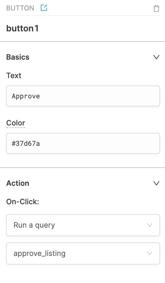 Now let’s hook them up to the right buttons: click on each button, and in the right sidebar in the action section, choose the right query from the dropdown. For the approve button we’ll choose the approve_listing query, and so on.