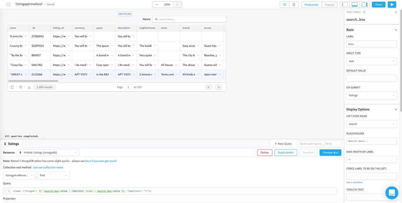 We’ll hook the search_box up to our listings query through a filter: replace the empty brackets ({}) in our listing query with {name: {"$regex": {{ !search_box.value ? {$exists: true} : search_box.value }}, "$options": "i"}}. This little snippet will check if the search box has any value in it: if not, it won’t apply any filters, and if there is a value, it’ll use Regex to search Mongo for that value in the “name” field. This is kind of like the MongoDB equivalent of SQL’s ILIKE operator. Don’t forget to save your query!