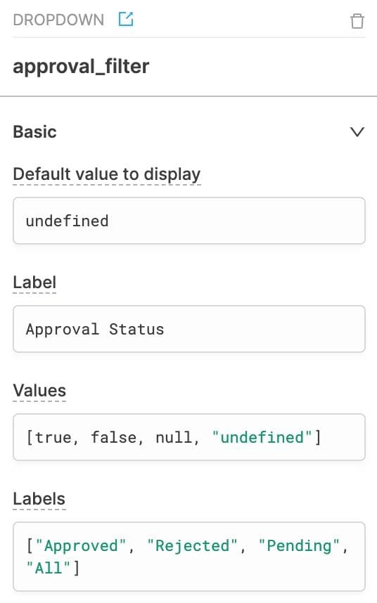 To get the approval_filter working, we’ll need to give it some labels and values, and update our listings query again. Click on the approval_filter and head over to the right sidebar: