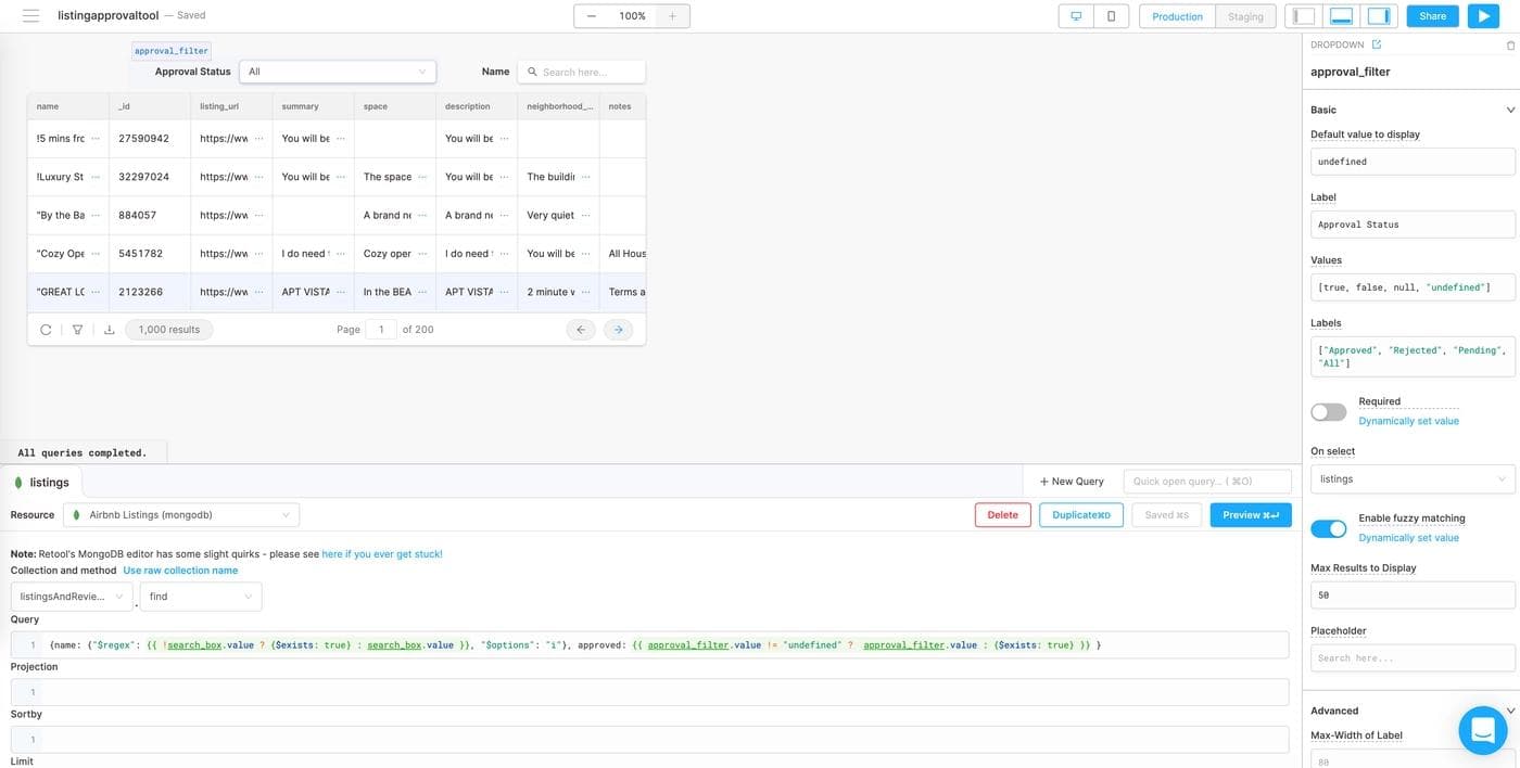 In the dropdown component, values map to labels in order, so when the Dropdown shows “Approved” it maps to true on the backend, when it shows “Rejected” it maps to false, and so on and so forth. Let’s also make sure we choose the “listings” query in the “on select” parameter on the right sidebar so the listings query reruns every time the approval_filter is updated.