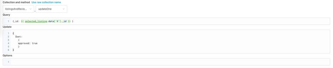 Let’s start with approval. Create a new query called approve_listing, and put {_id: {{ selected_listing.data['0']._id }} } into the “query” field. In the “update” field, we’ll put a MongoDB statement that updates the approved field to true: