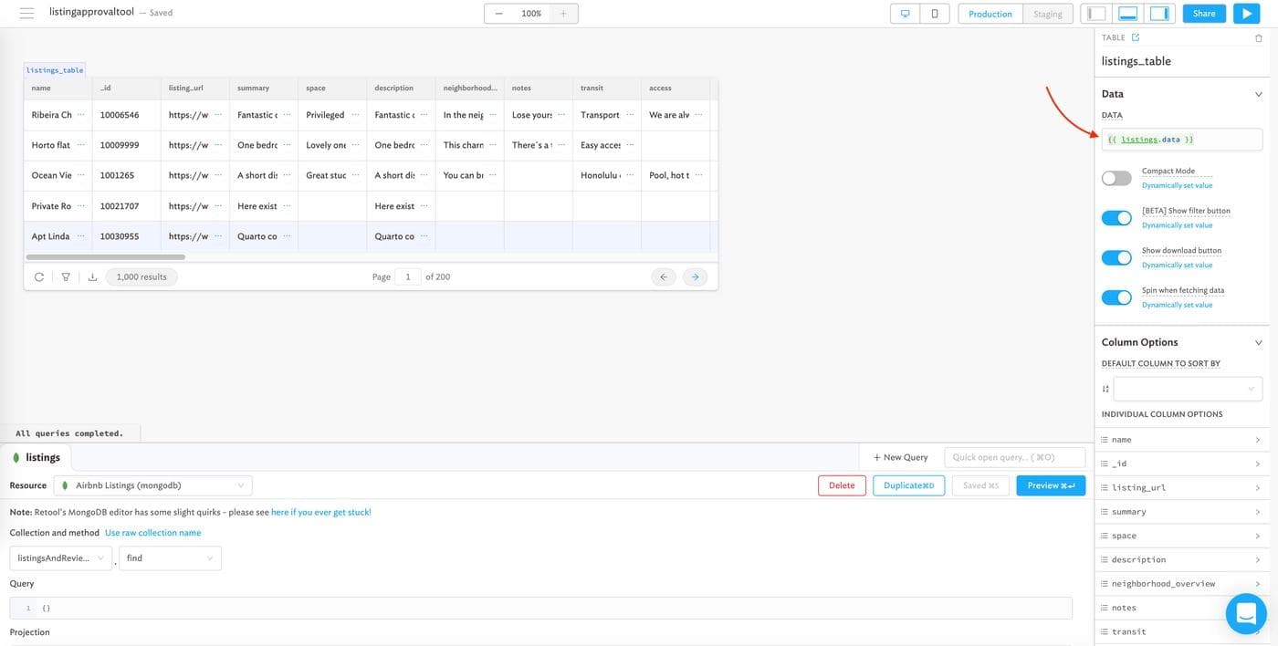 Now that we have a query, let’s connect it to our table: click on the table component, and the properties should show up on your right sidebar; in the “data” field, put a reference to the “listings” query with {{ listings.data }}. Now the table should have actual data from MongoDB. Off to a good start! Finally, let’s name the table “listings_table” so we can reference it more easily in the future. Here’s what the final config should look like: