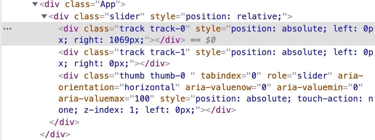 This brings us to an important point about react-slider, which is that it’s not really an out-of-the-box solution. You can think of it like d3 – it’s more of a lower level framework that prioritizes customizability and power over ease of use (“just building a chart”). In its most basic form, it’s simply some div elements. To make them display in your app, you have to do some basic styling.