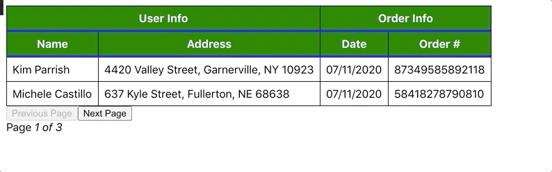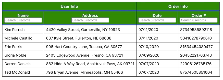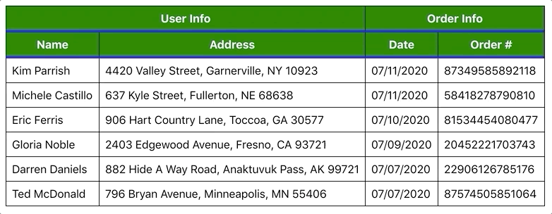 1 2 3 4 5 6 7 8 9 10 11 12 13 14 15 16 17 18 19 20 21 22 23 24 25 26 27 28 29 30 31 32 33 34 35 36 37 38 39const data = React.useMemo(() => [{ name: 'Kim Parrish', address: '4420 Valley Street, Garnerville, NY 10923', date: '07/11/2020', order: '87349585892118', }, { name: 'Michele Castillo', address: '637 Kyle Street, Fullerton, NE 68638', date: '07/11/2020', order: '58418278790810', }, { name: 'Eric Ferris', address: '906 Hart Country Lane, Toccoa, GA 30577', date: '07/10/2020', order: '81534454080477', }, { name: 'Gloria Noble', address: '2403 Edgewood Avenue, Fresno, CA 93721', date: '07/09/2020', order: '20452221703743', }, { name: 'Darren Daniels', address: '882 Hide A Way Road, Anaktuvuk Pass, AK 99721', date: '07/07/2020', order: '22906126785176', }, { name: 'Ted McDonald', address: '796 Bryan Avenue, Minneapolis, MN 55406', date: '07/07/2020', order: '87574505851064', }, ], [] )