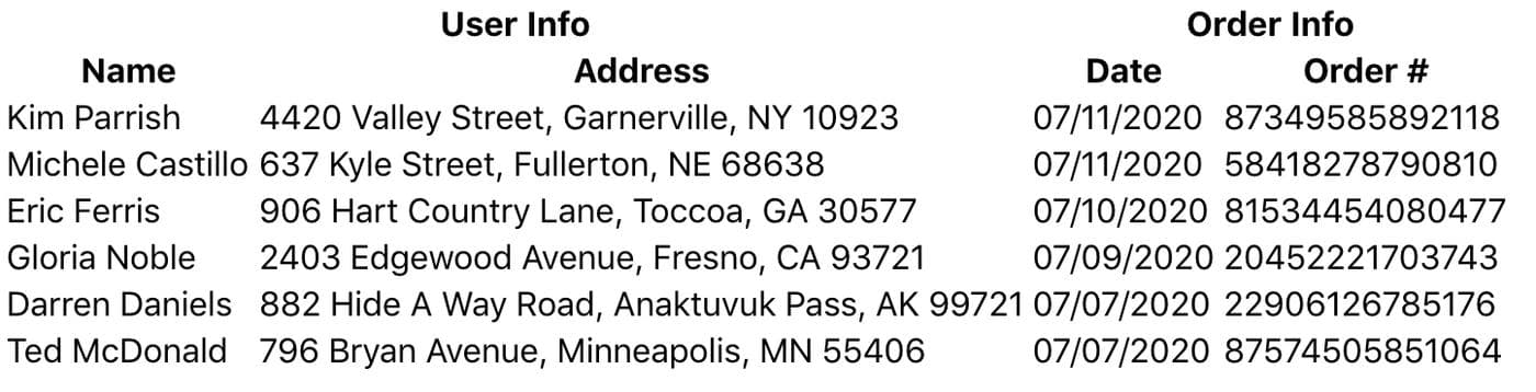 Let’s imagine that we are building a table to display order information for customer service reps. Our table will need to display customer info (name and address) and order info (order number and date) for each customer’s purchase.