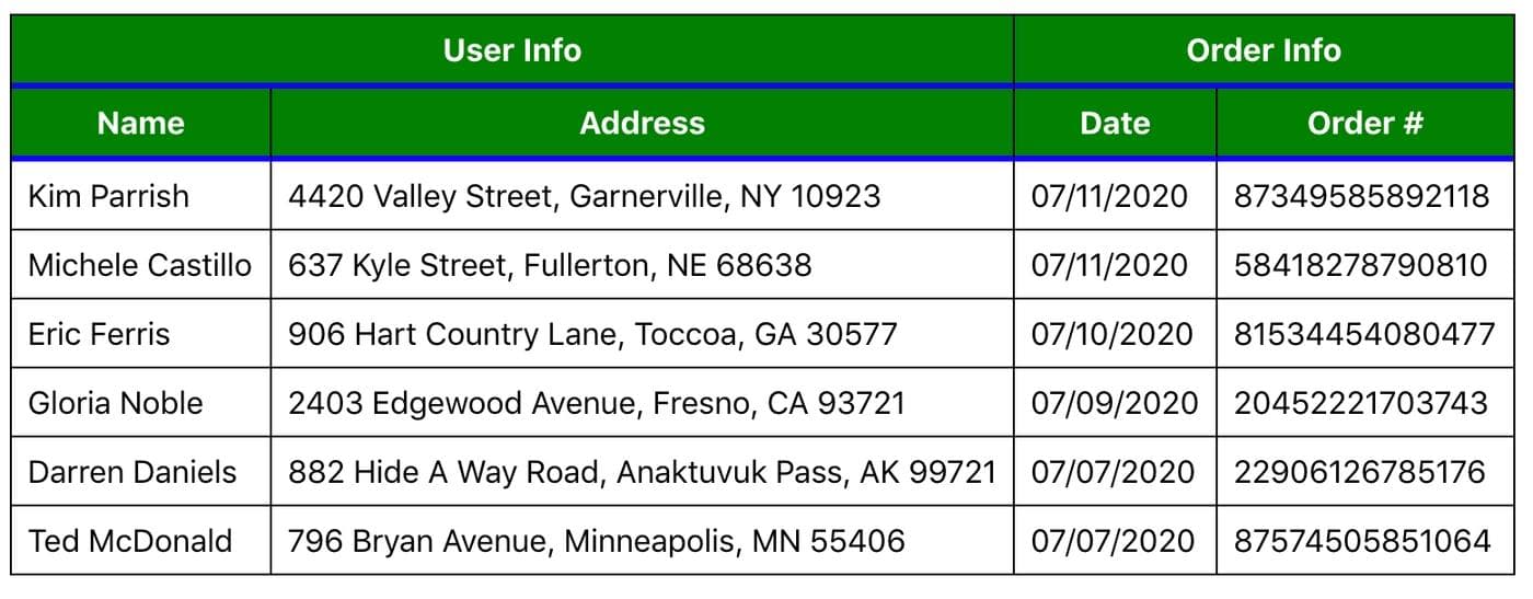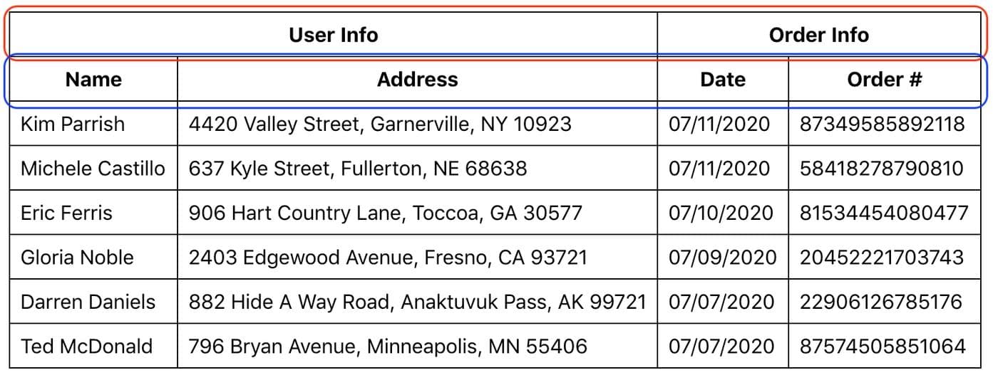 First, we’ll build a basic table to display data, no styling or extra features. Our customer support reps need an easy way to view order information for each customer. Our simple table will have two top-level headers: User Info and Order Info. Under User Info, we need two secondary headers to display each customer’s Name and Address. Under Order Info, we need two more secondary headers to display the Date that the order was made and the Order Number.