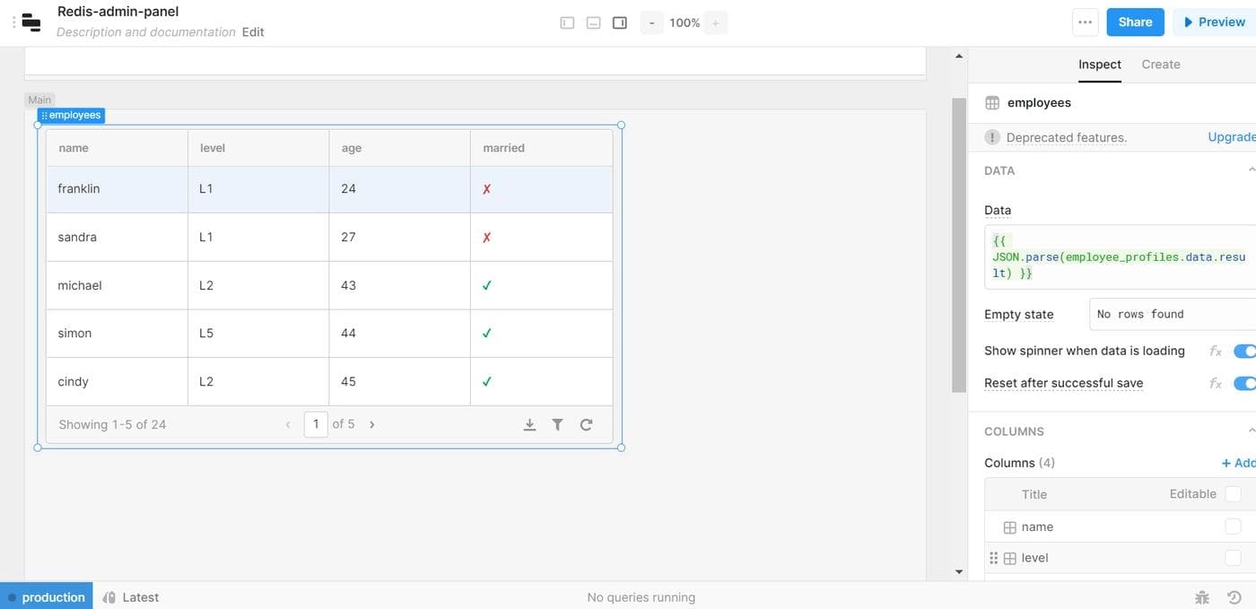 Note: In Retool, we can write JavaScript inside double curly braces {{ }}. After our employee_profiles query is run, the list of employees will be returned inside employee_profiles.data.result. RedisJSON returns the list as an array of objects wrapped in a string. Therefore, in order to remove the string around the array, we need to pass the list to JSON.parse().