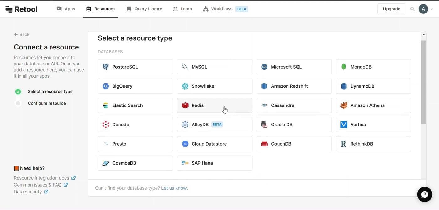 There is a tab in Retool called Resources that lets us connect to our database or API. Since we will be working with a Redis database in this tutorial, we will need to create the resource for working with Redis data.