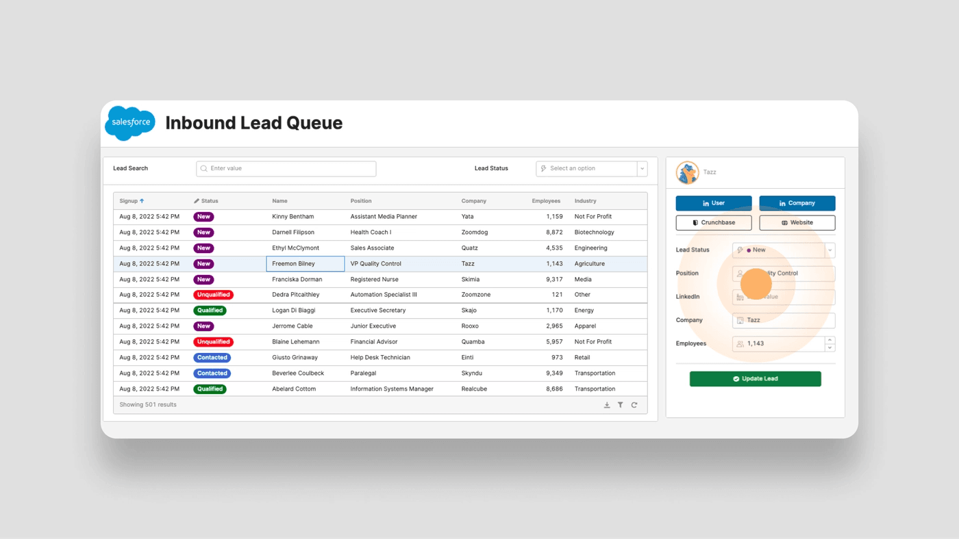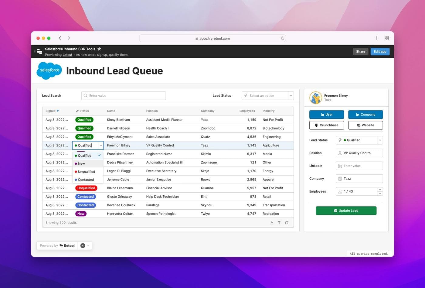 In this tutorial, you'll build a tool to manage Salesforce leads using Retool. The app will allow your sales team to enrich and qualify new leads all in one action.