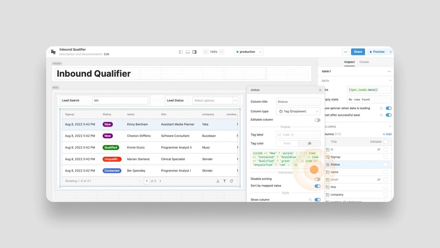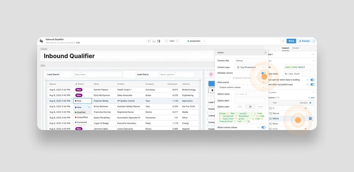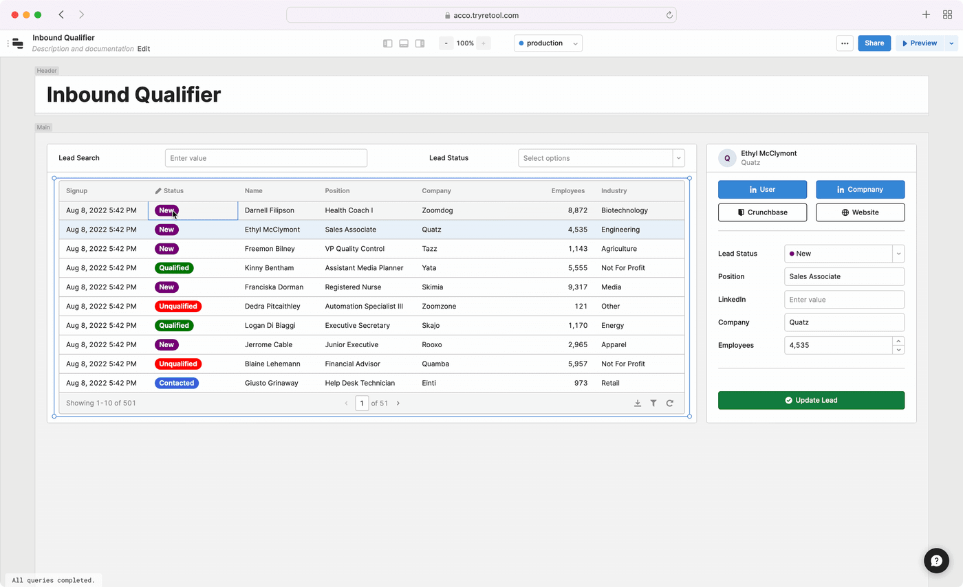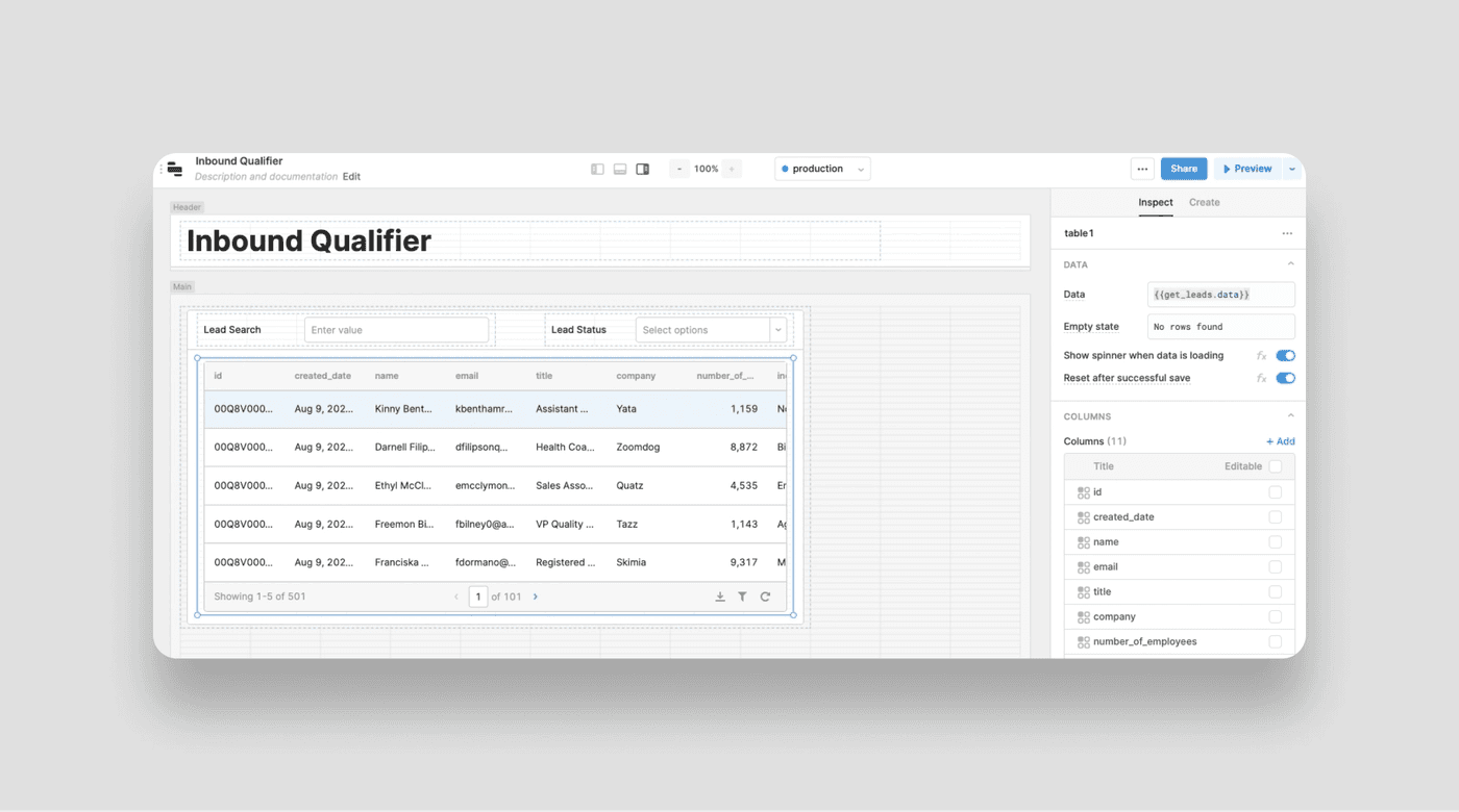 With Salesforce successfully connected to Retool using Sequin, you are ready to build an app that allows your sales team to quickly qualify leads.