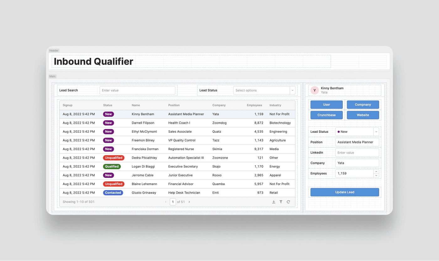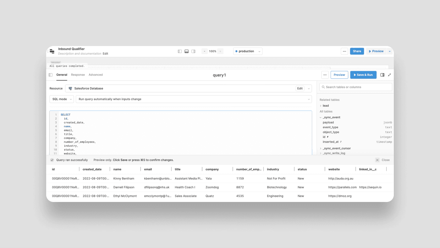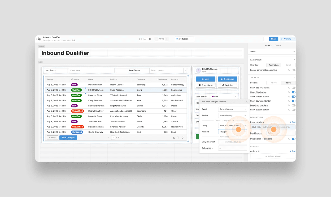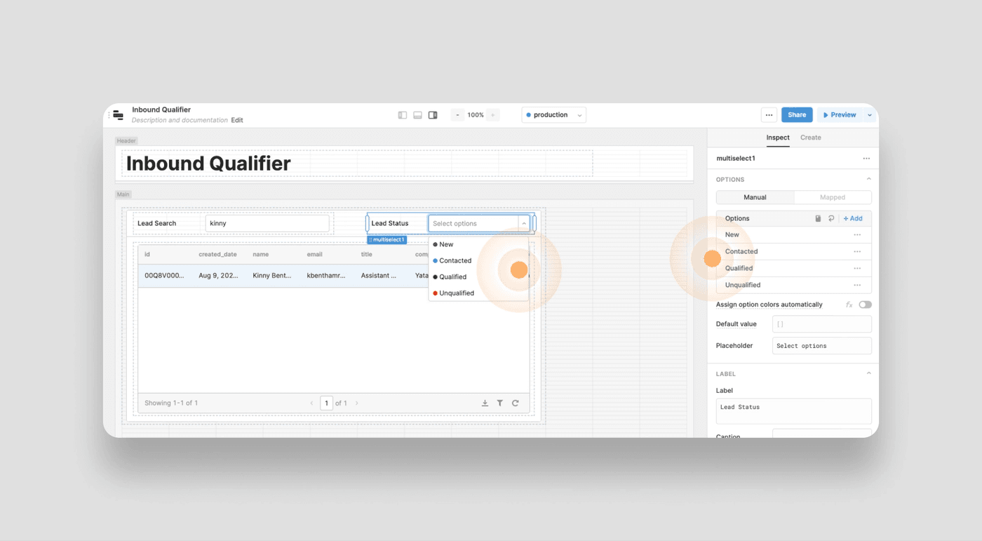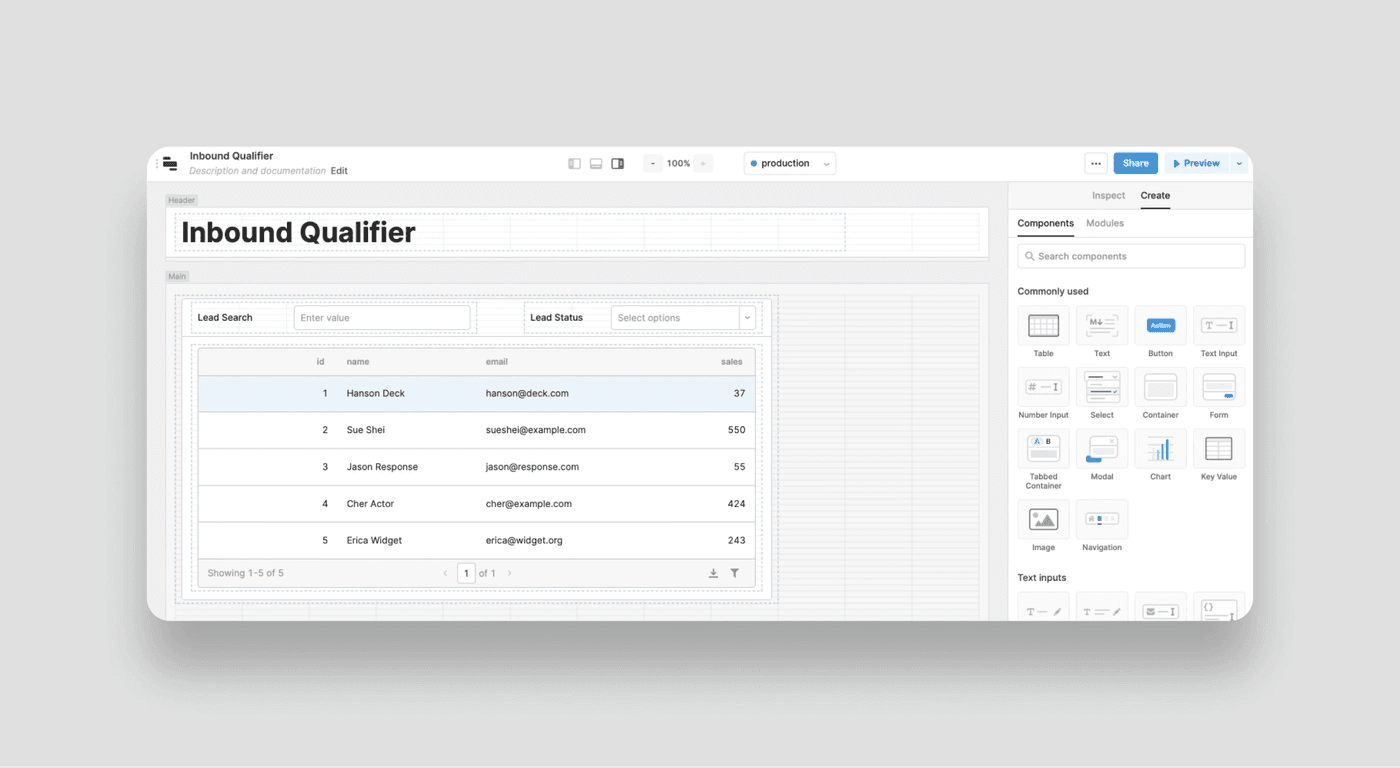 With Salesforce successfully connected to Retool using Sequin, you are ready to build an app that allows your sales team to quickly qualify leads.
