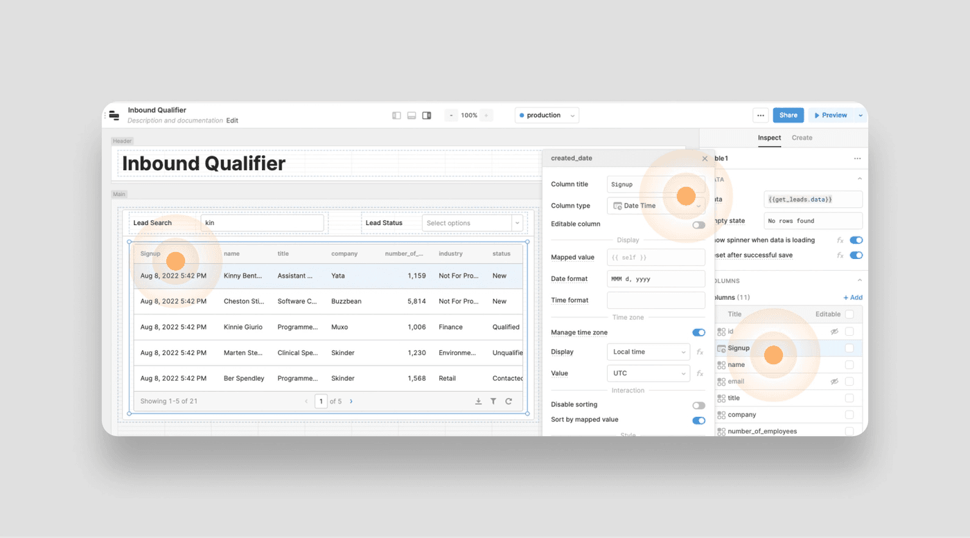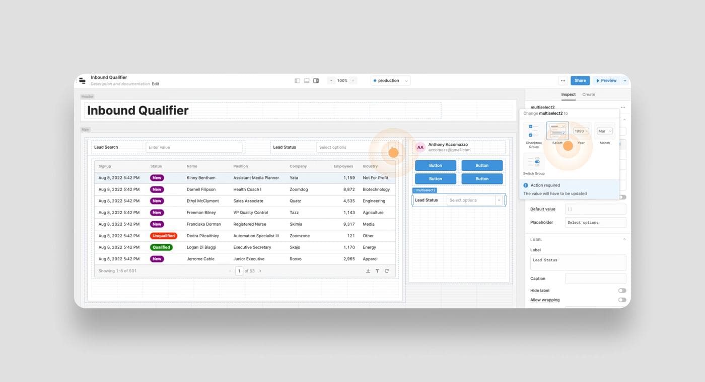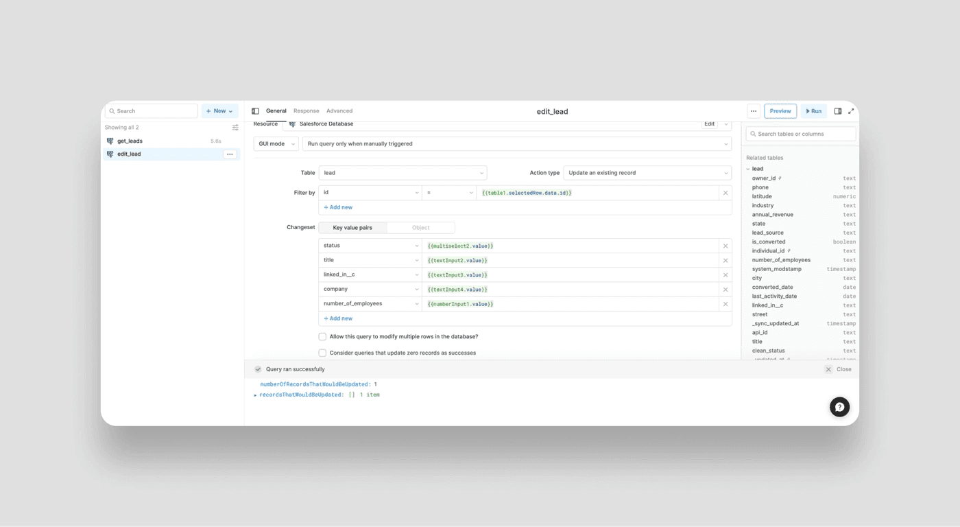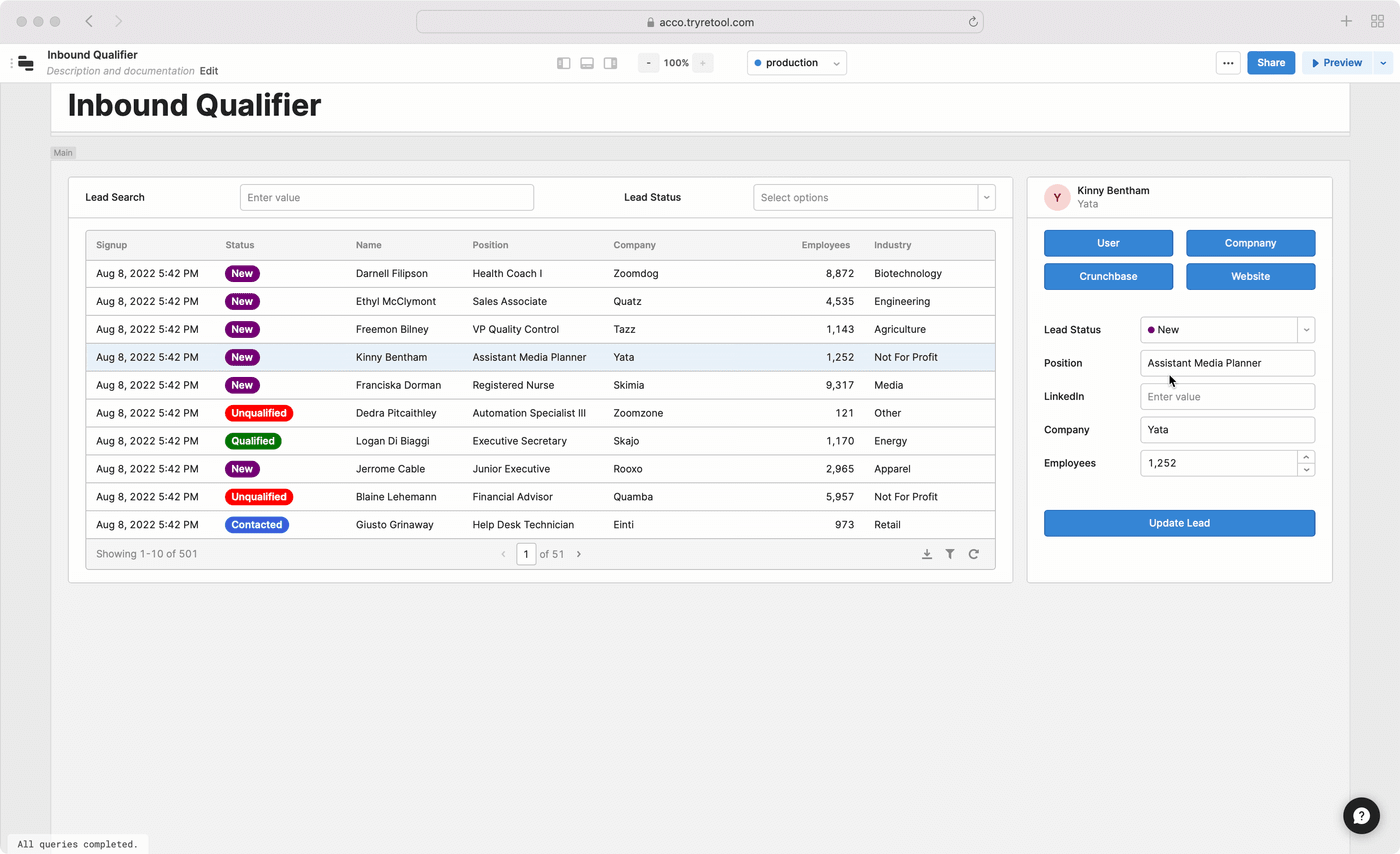 With Salesforce successfully connected to Retool using Sequin, you are ready to build an app that allows your sales team to quickly qualify leads.