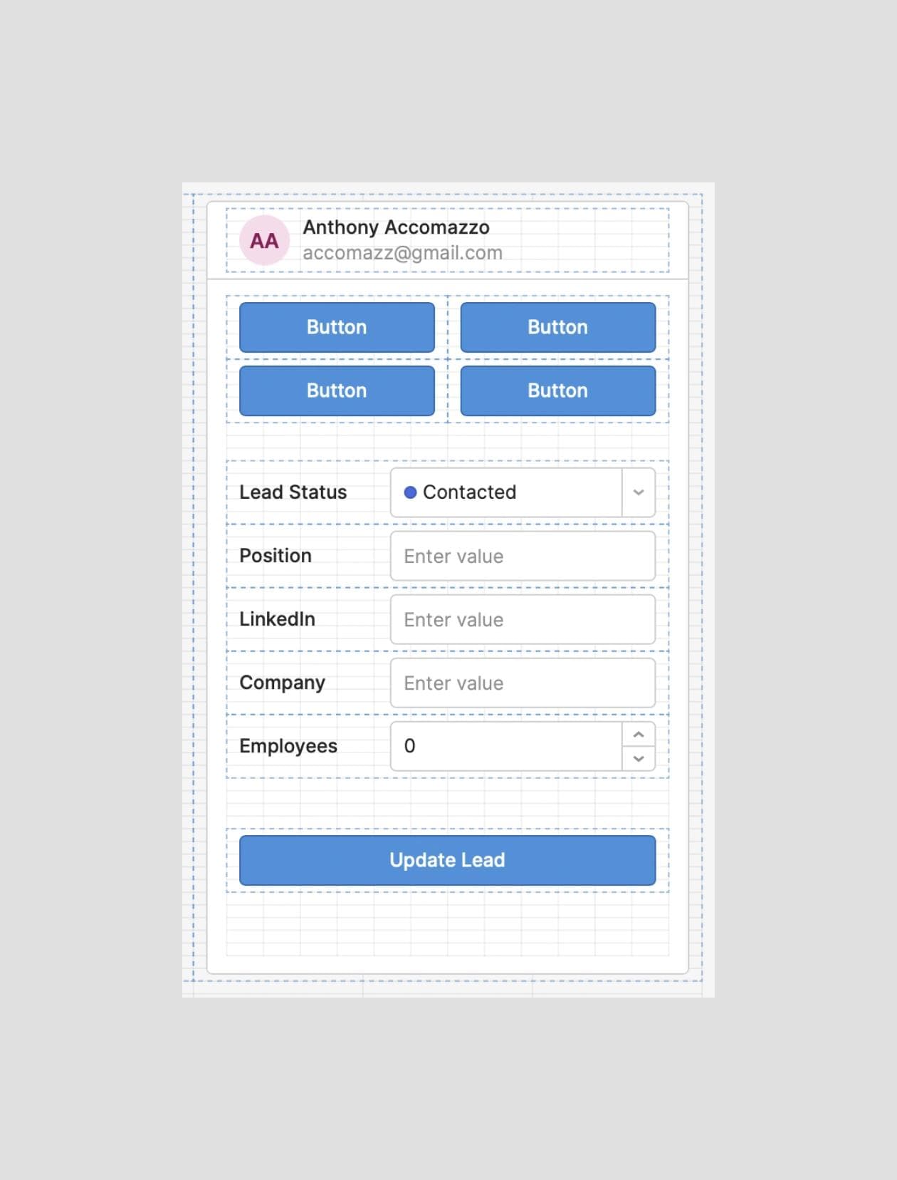 You'll connect data to this section of your app in three phases. First, you'll want to populate the avatar and text input components with the details (eg. name, title, etc.) of the lead selected in the table. Next, you'll configure the quick link buttons. And finally, you'll make the form work by connecting the Update Lead button to a query that updates your Sequin database and Salesforce simultaneously.