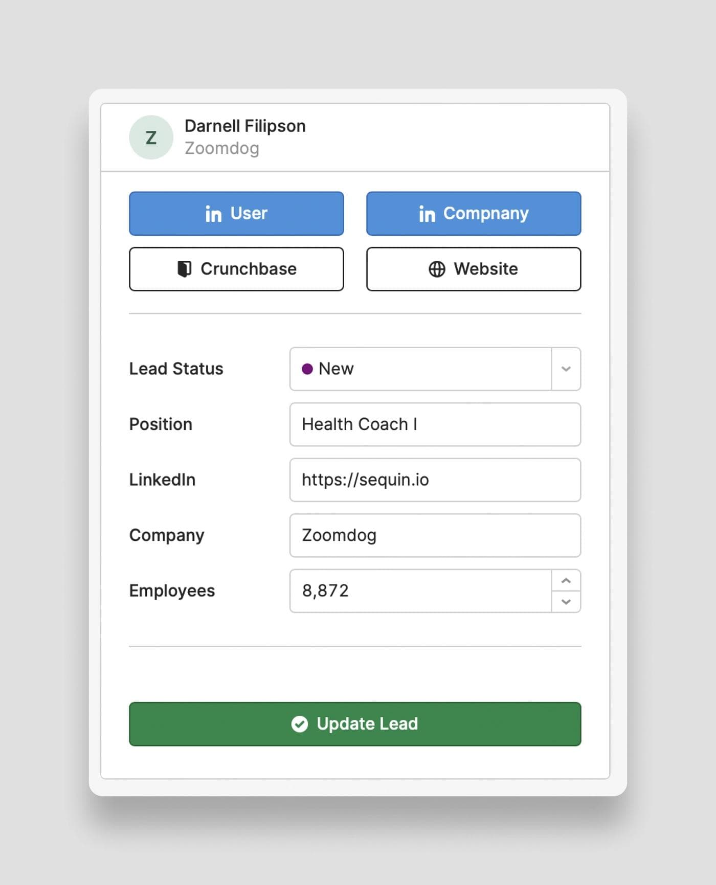 As the sales team learns about the lead, they'll add a LinkedIn profile URL and enrich the leads details. When they are done, they'll click the Update Lead button to push those changes back to Salesforce. You'll now write the SQL query that will post these changes to your Sequin database. From there, Sequin will handle the sync with Salesforce.