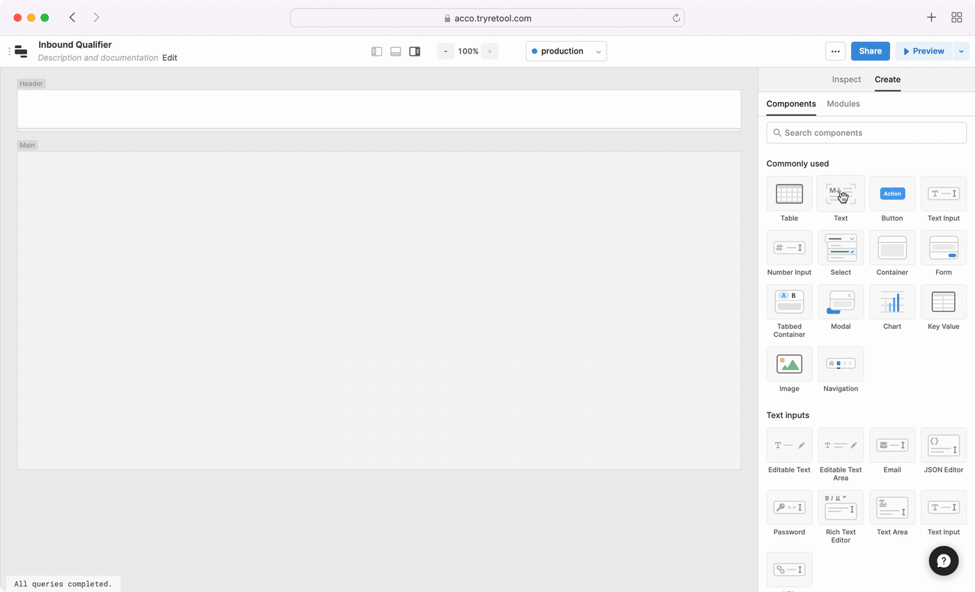 - You'll now see a blank Retool app in edit mode. To start building the app, drag and drop a text field into the header. Then, in the inspector panel on the right, enter