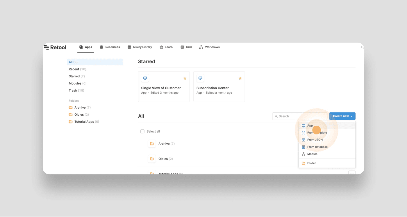 - In a new tab, log into Retool. In the top menu bar click Resources and then the blue Create New button.