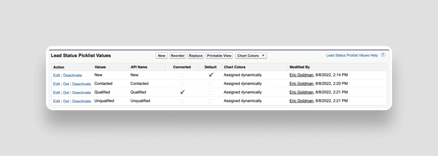 If you want to follow this guide exactly as written, you'll also want to customize the Lead Status options in Salesforce. These are the statuses your sales team will use to indicate if a lead is a good fit.