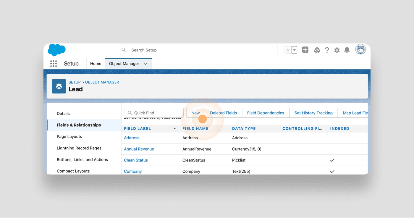 - In the Object Manager, use the Quick Find again to find and select the Lead object.