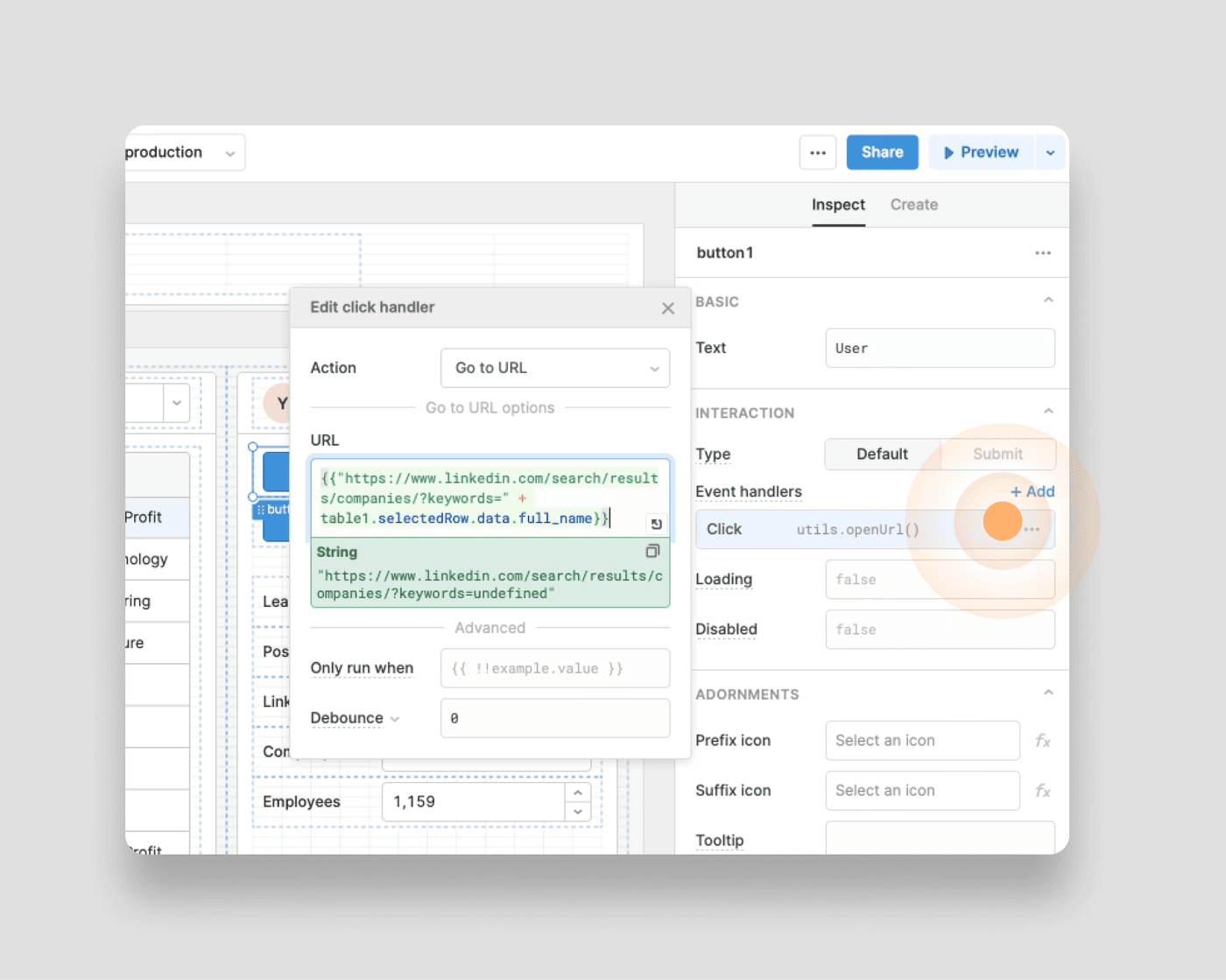 Button Text URL Company {{"https://www.linkedin.com/search/results/companies/?keywords=" + table1.selectedRow.data.company}} Crunchbase {{"https://www.crunchbase.com/textsearch?q=" + table1.selectedRow.data.company}} Website {{table1.selectedRow.data.website}}
