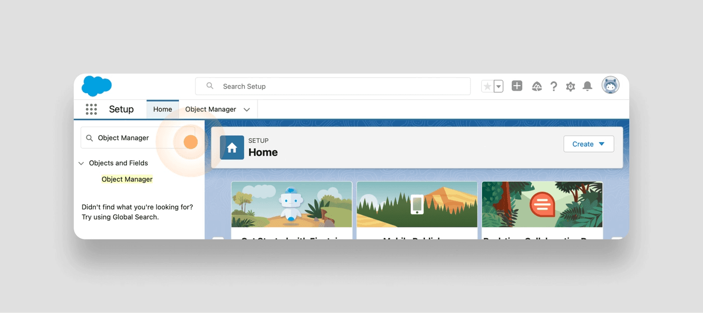 - The setup screen will open in a new tab. Now use the Quick Find to find and open the Object Manager: