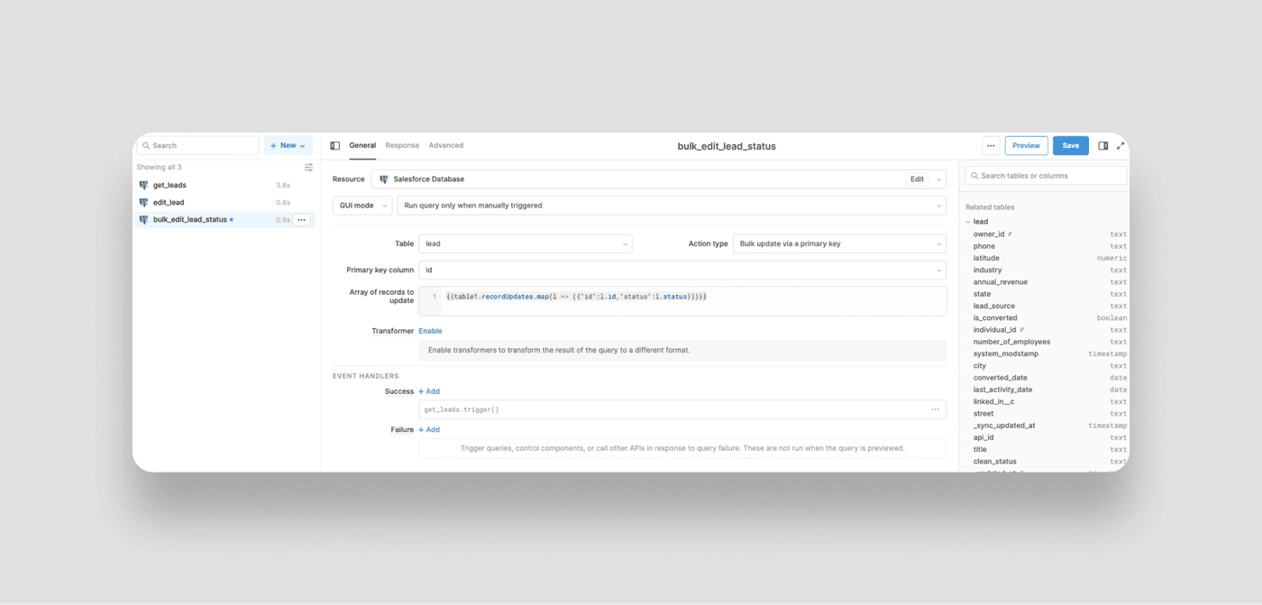 idfrom the array of objects intable1.recordUpdates, find the records that match theidin yourSalesforce Database, and thenUPDATEthestatusfield in those records. Click to Save your query and name itbulk_edit_lead_statusin the query list on the left.- Resource -